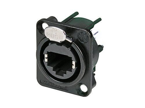 Conector de Chasis vertical RJ45 para montaje en panel de PCB, brida metálica negra en forma de D con pestillo, máx. grosor del panel de 4 mm, tornillos de montaje no incluidos La serie etherCON es un sistema de conector RJ45 resistente y bloqueable, optimizado para aplicaciones de red de rayos, video y audio profesional. Los conectores del chasis están diseñados para encajar en paneles estandarizados de la industria del entretenimiento. La serie D ofrece el diseño más resistente de la serie etherCON y es perfectamente adecuada para el mercado de instalación y montaje en panel. ¡Atención! No se interconecta con los cables del conector de cable CAT6 NE8MC6-MO y NKE6S*.