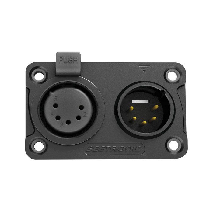 Este chasis con combinación de entrada y salida de 5 pines XRL es un conector de red con combinación dual y contactos chapados en oro. Incluye un tapón de sellado que cuenta con clasificación IP65 cuando está cerrado o cuando lleva insertado el correspondiente conector de red XLR con clasificación IP65.