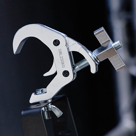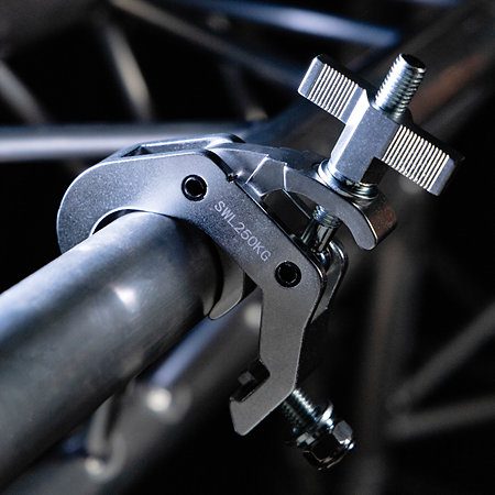 Con una capacidad de carga de hasta 250 kg, esta abrazadera ofrece una sujeción fiable, ya sea para su uso en una fiesta privada, en un club o para una instalación más ambiciosa en un evento. Su acabado plateado le da un aspecto elegante que combina perfectamente con las estructuras de aluminio utilizadas en los eventos.
