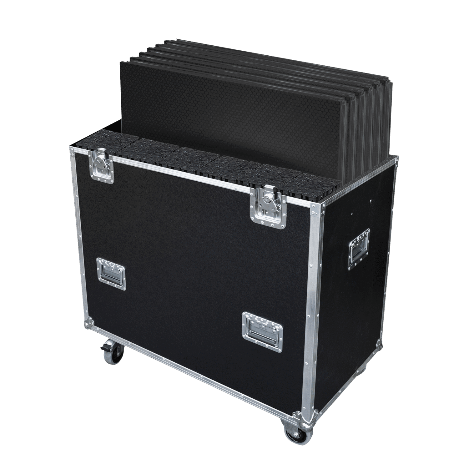 Este flight case tiene espacio suficiente para las tarimas del sistema Mammoth Stage de 6 m² incluyendo las patas necesarias, es ideal para una plataforma para batería de 2 x 2 m y una plataforma de teclados de 2 x 1 m.