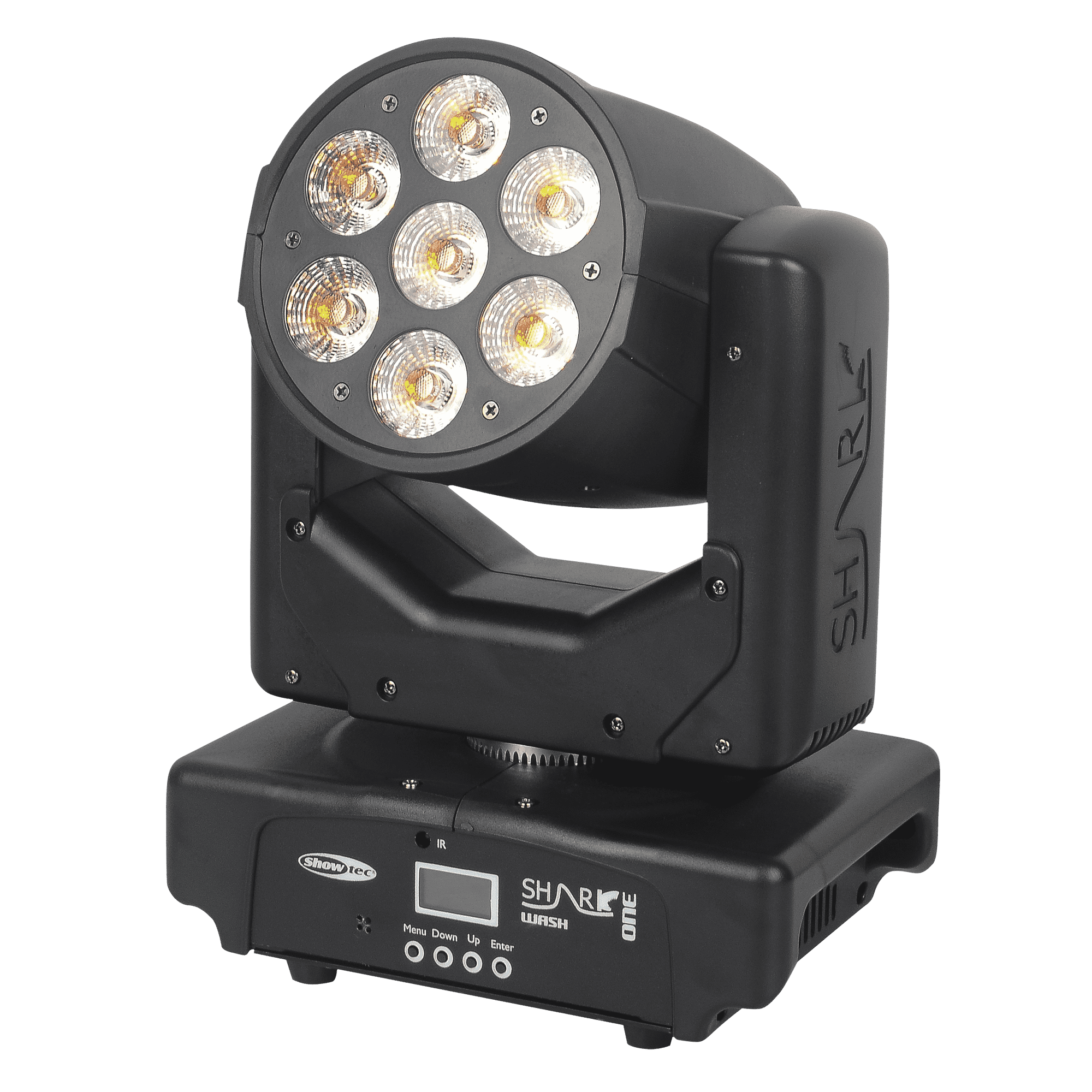 El Showtec Shark Wash One es una cabeza móvil Wash compacta y fiable con 7 x 12 Watt LED RGBWA-UV con una ángulo fijo de 25° adecuada para instalaciones interiores con techos bajos. Los efectos dimmer y estrobo son controlables a través de DMX y en los modos Auto, Sound y Master/Slave. Además, el Shark Wash One se puede controlar con el mando a distancia de infrarrojos incluido. Con sólo pulsar un botón puedes activar los programas Auto y Sound, así como cualquier efecto o función disponible.