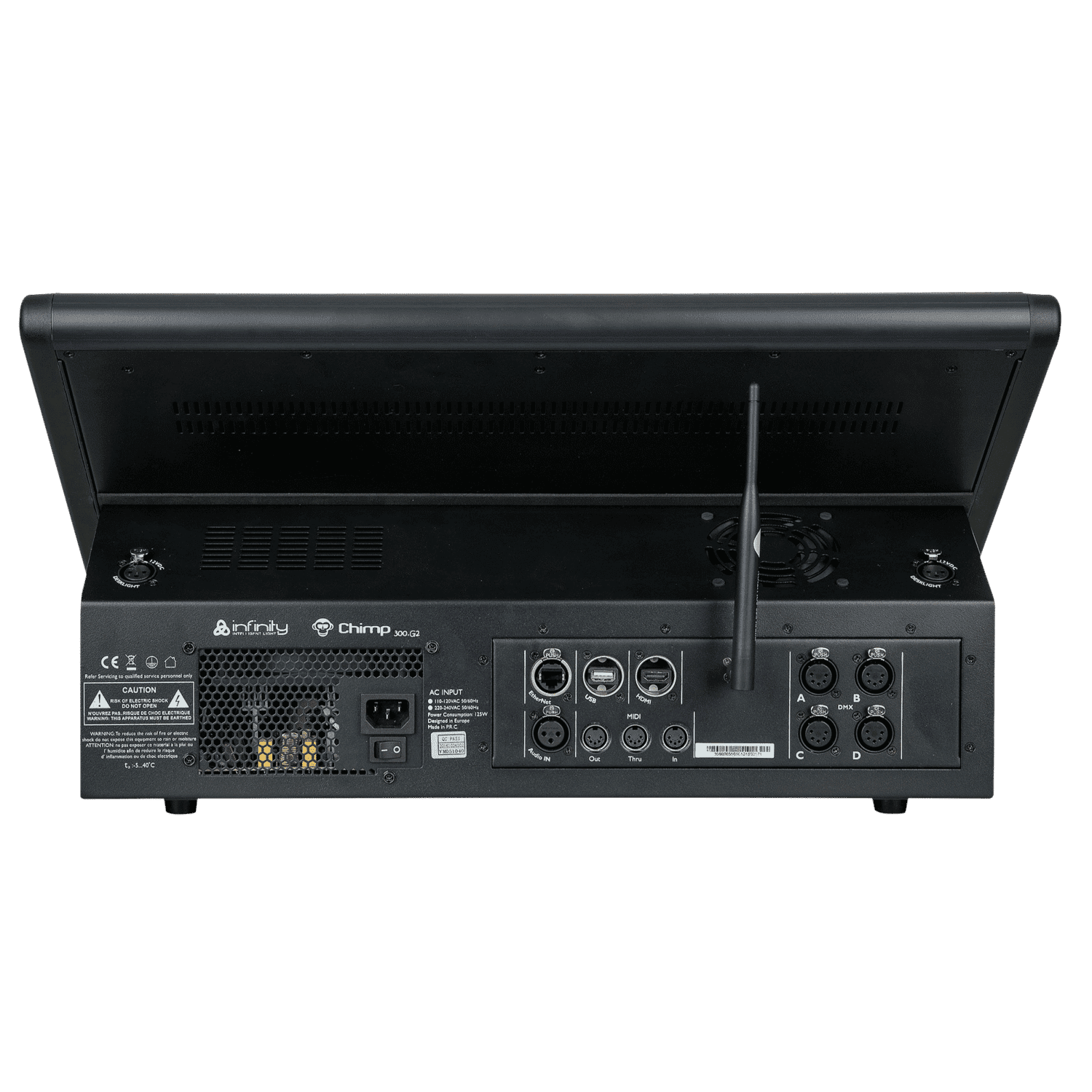 Chimp G2, The next stage: los controladores de luces Infinity Chimp G2 combinan un diseño práctico con verdadera funcionalidad: el Chimp 100.G2 con 2 universos DMX o el 300.G2 con 4 universos DMX y pantalla táctil de 22″ integrada. Ambos se basan en el mismo principio: proporcionar las herramientas necesarias a todos los diseñadores de iluminación y ofrecerles la libertad que se merecen para crear el espectáculo que desean. Cada función, efecto y aplicación se ha desarrollado especialmente para apoyar este mismo principio. Aunque el Chimp 300.G2 tiene una mayor capacidad de universos, dispositivos y memoria, sigue siendo compatible con el Chimp 100.G2. El software, las funciones, los efectos y las posibilidades son exactamente los mismos. Los espectáculos programados y guardados en cualquiera de las dos unidades Chimp son intercambiables y se ejecutarán a la perfección. Esta sola característica añade una nueva dimensión a la compatibilidad de las diferentes unidades Chimp.