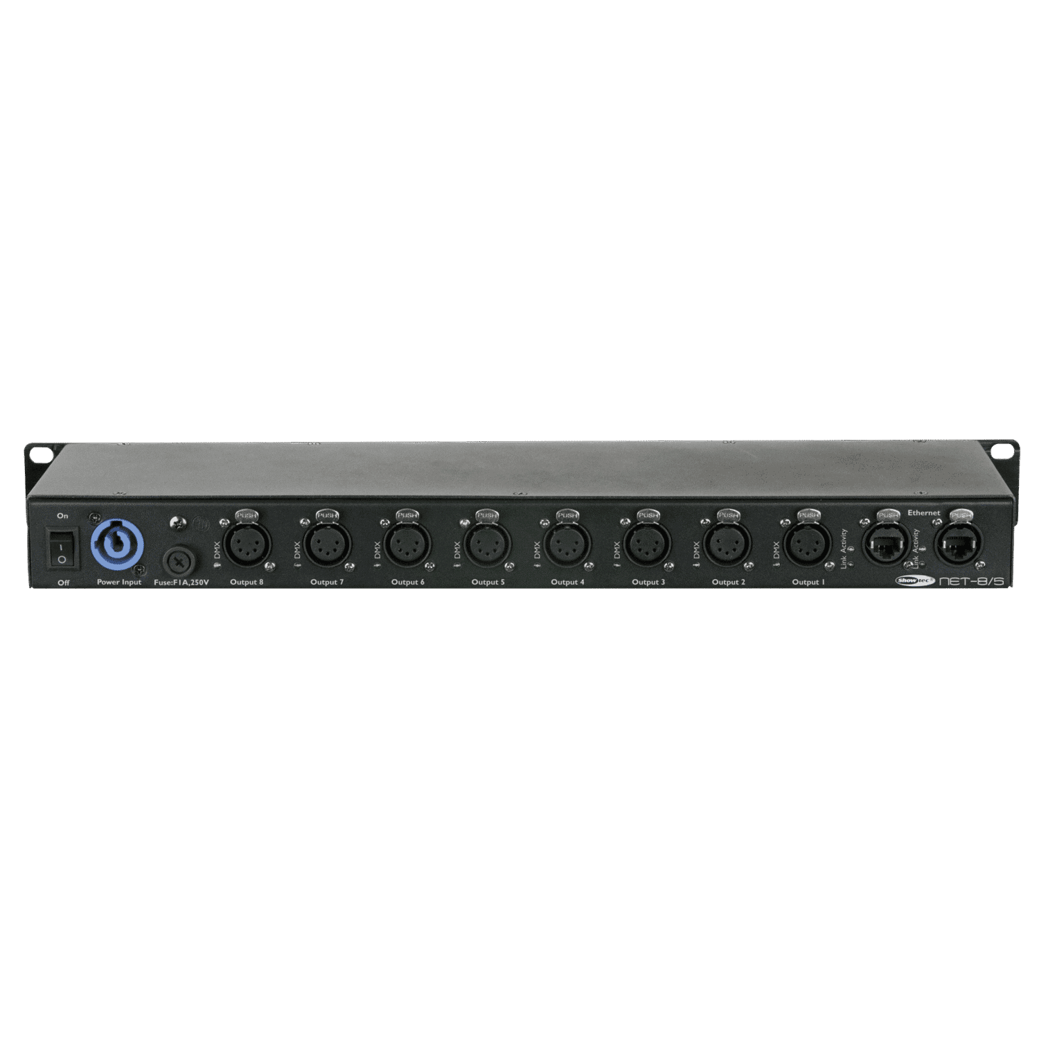 Los nodos Showtec NET-8/3 y NET-8/5 son dispositivos avanzados de enrutamiento de red que convierten Art-Net a DMX-512 y viceversa. Es posible transportar hasta un máximo de 4096 canales en un único cable CAT5. Gracias a esta característica el nodo NET-8/x es apropiado para eventos de pequeña a gran escala. El nodo NET-8/x cuenta con un conmutador de red incorporado que le permite utilizarlo como un repetidor de Ethernet, al igual que como 8 universos DMX-512 separados y que se pueden usar como entrada o salida. Todos los ajustes se pueden configurar a través de un sencillo menú en la pantalla gráfica y los botones del frontal.