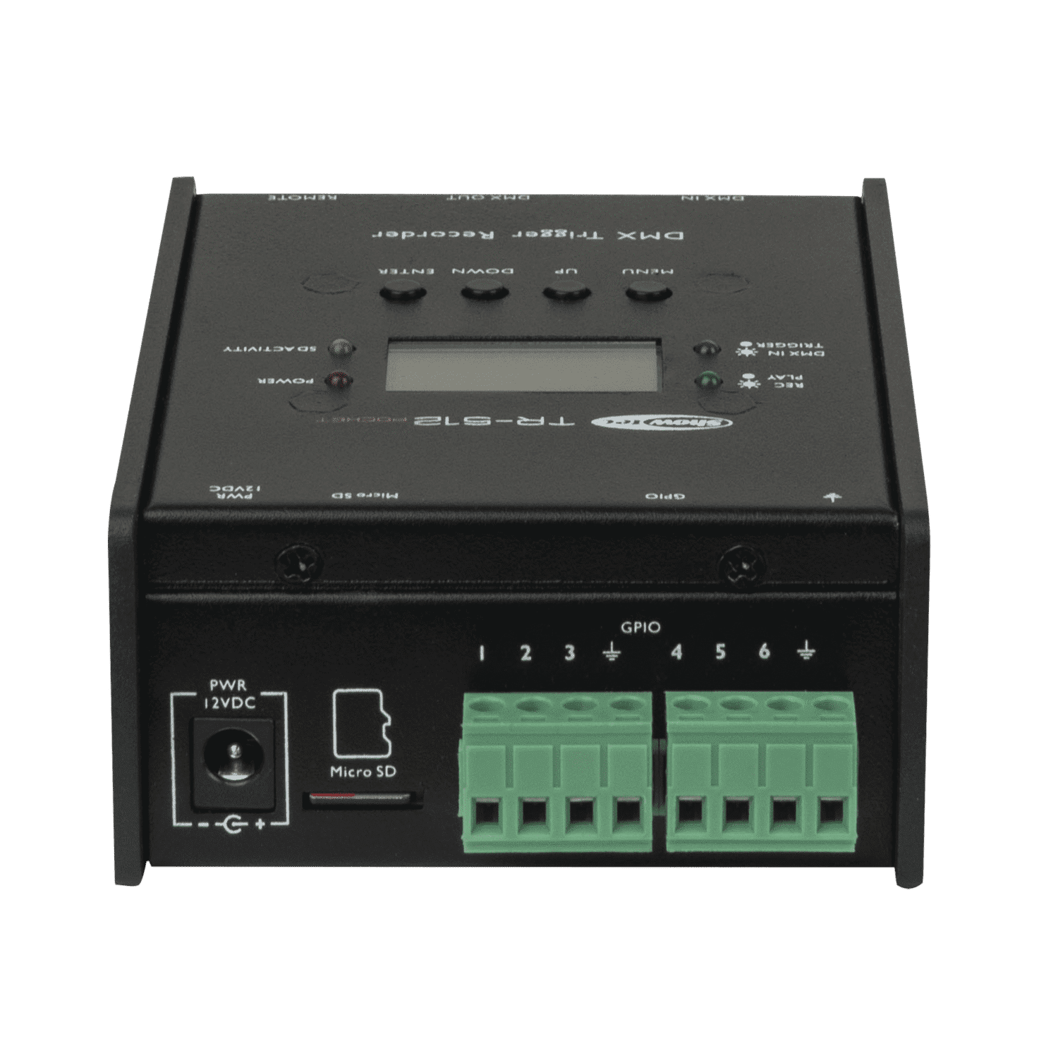 El TR-512 Pocket puede grabar y reproducir varios espectáculos, que se almacenan en la tarjeta micro-SD incluida. La tarjeta es lo suficientemente grande como para albergar espectáculos de 24 horas de duración. Cada programa puede reproducirse en modo de bucle o en reproducción individual. Se puede configurar un inicio automático al encender el aparato o un inicio diferido. Hay 6 pines GPIO disponibles para iniciar o detener tus espectáculos utilizando activadores externos, como interruptores normales, relés, sensores de detección de movimiento, etc.