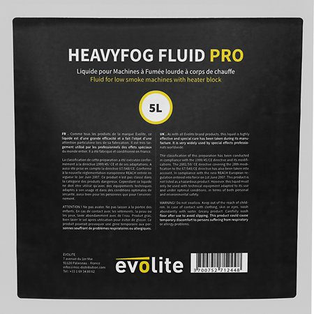 El fluido Evolite HeavyFog PRO 5L completa el paquete. Fabricado en Francia y con certificación NF y CE, no deja residuos ni depósitos pegajosos. Su composición de alta pureza química produce una niebla blanca uniforme y brillante. Compatible con todas las máquinas de trabajo pesado, es el lugar perfecto para que alcance su máximo potencial.