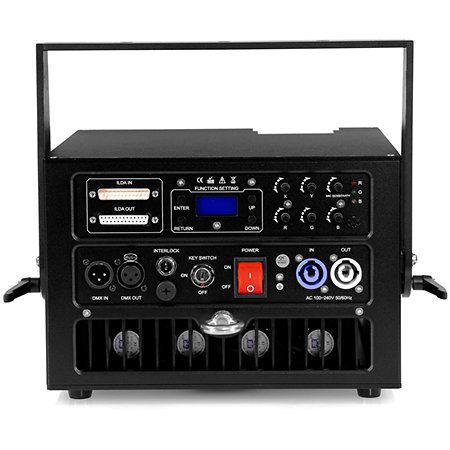 Potencia total de 6,6 W, longitud de onda de 638 nm para rojo, 520 nm para verde, 445 nm para azul, escaneos galvo ultrarrápidos de 35 kpps, ideal para grandes eventos.