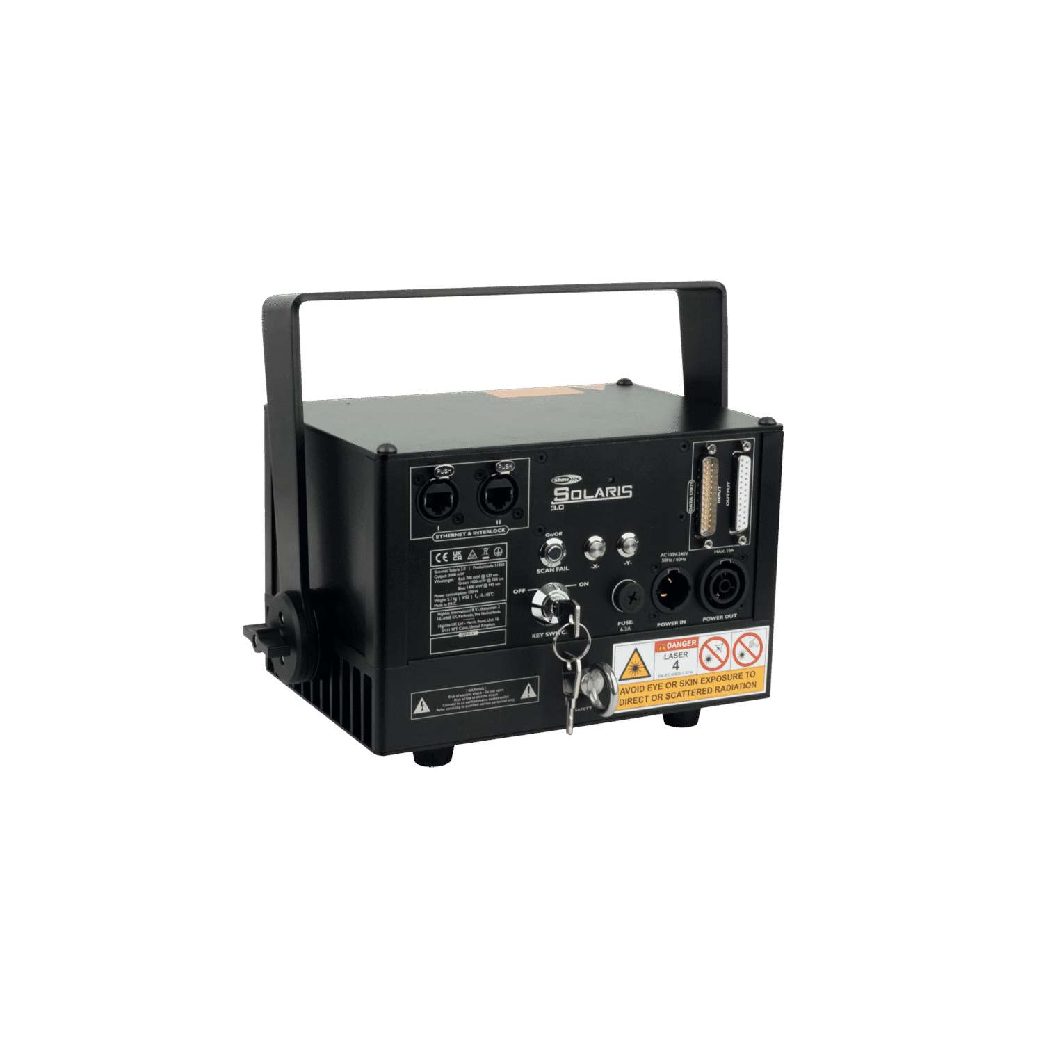 El Solaris 3.0 es un potente proyector láser RGB de 3.000 mW, diseñado para ser utilizado en lugares de gran tamaño. Puede controlarlo con su consola o software de iluminación de Ilda. Como usa modulación de atenuación analógica lineal, el Solaris 3.0 puede generar todo el espectro de colores. Su estructura exacta y de alta calidad garantiza una combinación perfecta de rayos RGB e imágenes sin distorsión. Su ángulo de proyección de 45° es apto para zonas de proyección grandes. Tiene todas las medidas de seguridad necesarias, como la protección de sobrecargas del sistema de escaneo, un sistema de bloqueo con clave, seguridad en caso de fallo del escaneo, una placa de enmascaramiento de apertura, un sistema de parada de emergencia y un mando con clave.