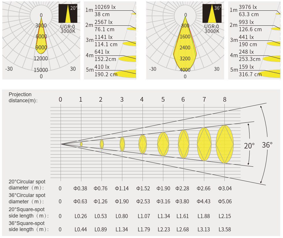 Este producto es adecuado para la iluminación de museos, galerías de arte, exposiciones de arte, etc.; también es adecuado para hoteles de alto nivel, restaurantes y otros establecimientos El usuario puede determinar el tamaño del haz de luz basándose en los datos ópticos de la colorimetría. Por ejemplo: un haz de luz de 1m x 1m requiere una distancia mínima de instalación de 2,5m.