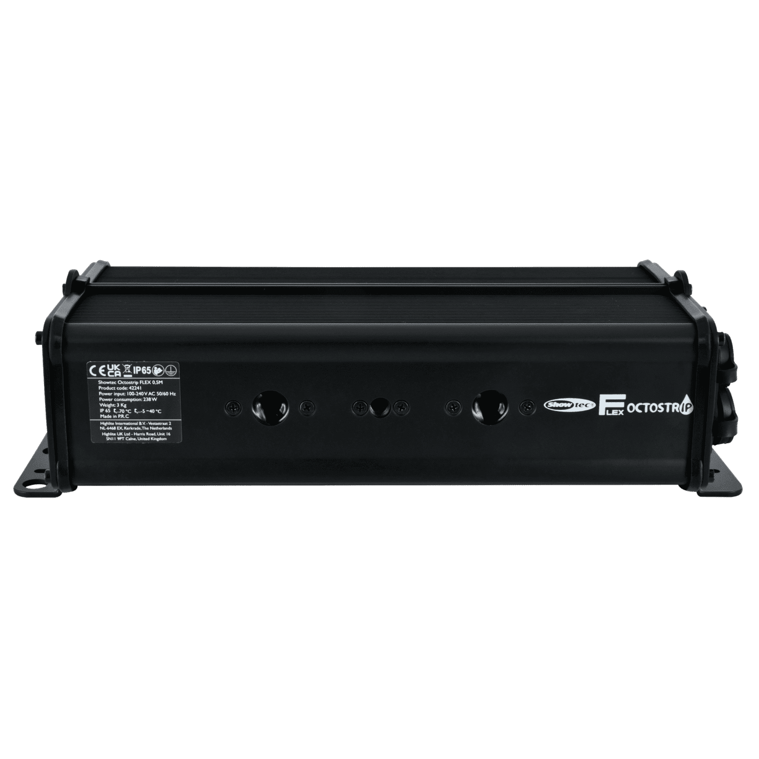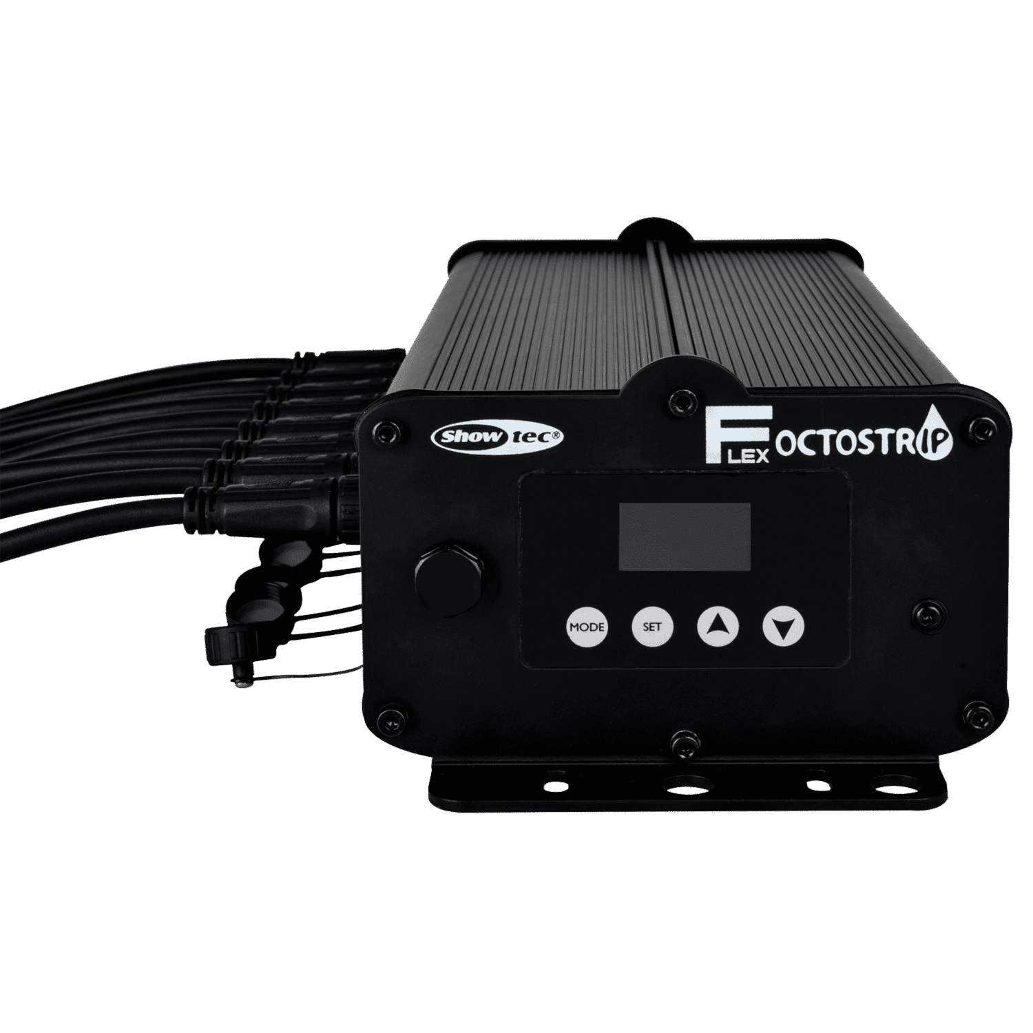 El Showtec Controller for Octostrip FLEX es un controlador dedicado con clasificación IP65 que puede controlar hasta 8 unidades de Showtec Single Strip for Octostrip FLEX. Puede controlar las versiones de 1 m y 0,5 m (no es posible mezclar ambas longitudes). El controlador es compatible con Art-Net y DMX, pero también tiene modos autónomos con presets y secuencias de color incorporados. Utiliza conexiones DMX XLR de 5 pines y conexiones de alimentación Power Pro True. Tiene una robusta carcasa de aluminio con múltiples opciones de montaje.