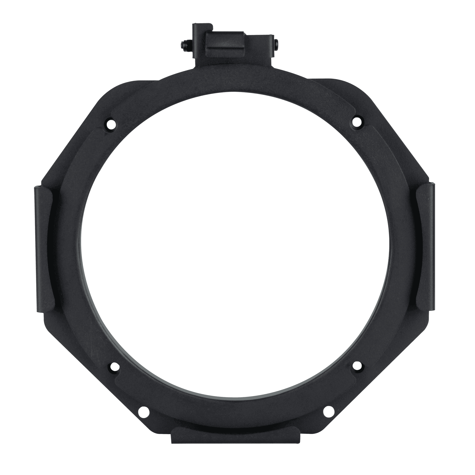 El soporte de accesorios para la serie Raccoon de Showtec es imprescindible para fijar accesorios como top hats o una visera barndoor. El soporte de accesorios no es necesario para cambiar un difusor. Sin embargo, es posible utilizar un difusor en combinación con otro accesorio. Gracias a sus cuatro tornillos de pulgar, el soporte de accesorios es fácil de fijar al cuerpo del Raccoon.