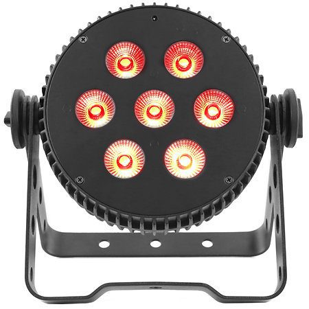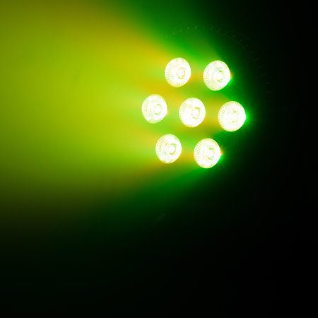 El Mac Mah SilentPAR 7X10W 4IN1 es un proyector LED PAR 4 en 1 ideal para iluminación arquitectónica y escenarios, ya sea sobre suelo o en truss. El dispositivo utiliza 7 LED de 10 W que emiten colores rojo, verde, azul y blanco con un ángulo de haz de 45°.