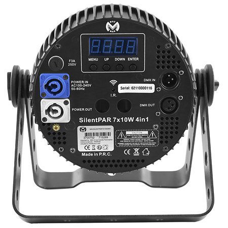 El soporte de tijera incluido permite diversas opciones de colocación e instalación. El SilentPAR 7X10W cuenta con una pantalla DMX digital de cuatro botones en el panel trasero, que permite elegir entre los diversos programas integrados y macros de color.