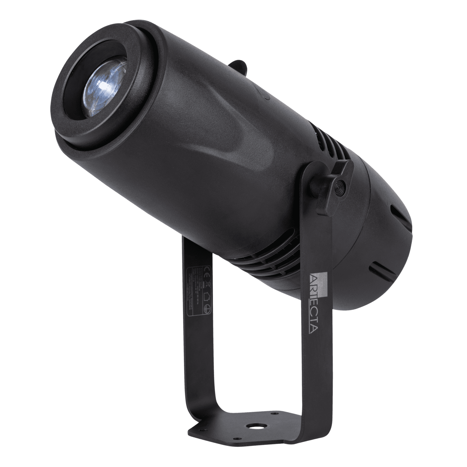 Artecta Gobo Spot 50 es un proyector de gobos compacto de 50 vatios, diseñado para proyectar logotipos y patrones nítidos y de gran impacto. Tiene un ángulo de haz fijo de 20° e integra un gobo de cristal reemplazable y giratorio (Ø 26,4 mm). Es ideal para comercios, hostelería y exposiciones. La velocidad de rotación y la dirección del gobo pueden ajustarse fácilmente mediante un mando de control en el panel trasero para lograr efectos visuales dinámicos sin necesidad de DMX. Para una mayor flexibilidad, hay disponible una lente opcional de 30° que permite una cobertura más amplia cuando sea necesario.