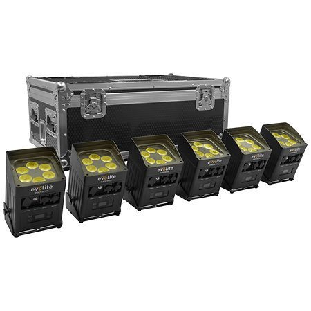 Conjunto profesional de seis proyectores LED IP-BOX 6X15W para exterior, con alimentación por red o batería recargable, se suministran en un robusto maletín de transporte con compartimentos y ruedas, con cargador integrado.