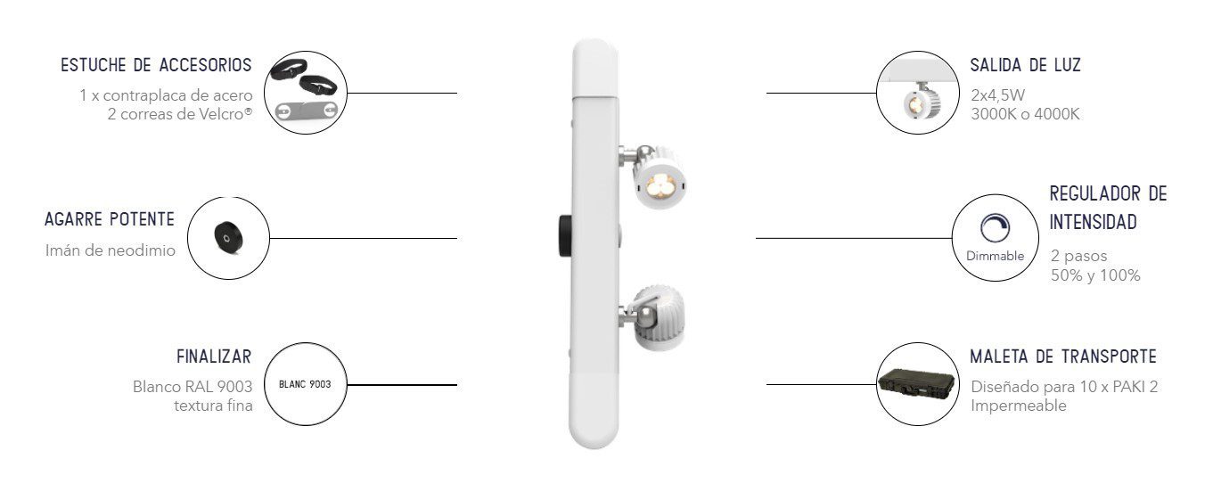 La K2 es una luminaria compacta y autónoma con 2 leds. Diseñado para una máxima versatilidad, K2 está equipado con un imán de neodimio y puede colocarse, fijarse o colgarse de la mayoría de las superficies o estructuras. Su longitud de 30 cm y su peso ligero, potencian la portabilidad de K2 y amplían su campo de posibilidades. El kit de accesorios permite acceder a los espacios de más difícil acceso, gracias a las correas de Velcro®, la contraplaca magnética y las eslingas metálicas. K2 se maneja manualmente con un simple interruptor de encendido/apagado y los dos leds Cree XPG2 por foco pueden montarse en 3000K o 4000K.