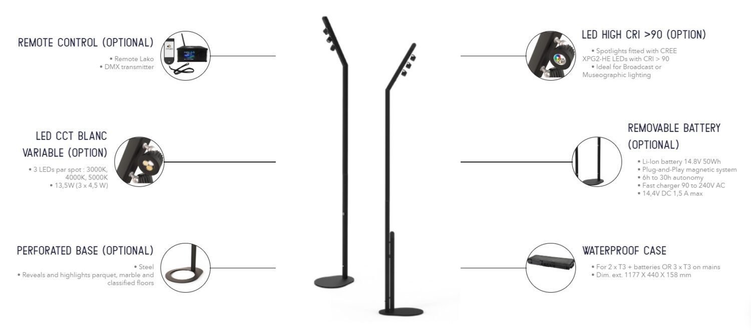 • Cabezal reversible, vertical o inclinado, que incluye 3 focos