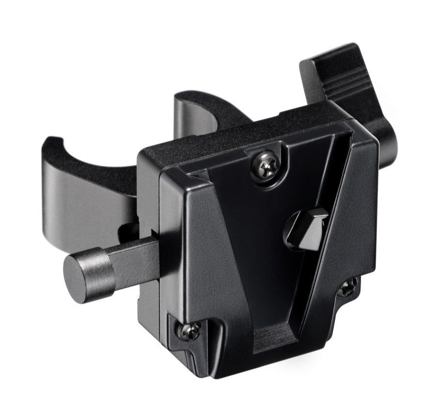 La abrazadera V-Mount permite fijar una batería V-Mount al yugo de la luminaria, a un raíl, a la pata de un trípode, a una mesa y a otros objetos mediante una abrazadera metálica de gran resistencia. Los contactos y conectores de la batería permanecen accesibles. Las mordazas de la pinza pueden abrirse hasta 35 mm de ancho. Dimensiones: aproximadamente 55 x 60 x 44 mm (2,2 x 2,8 x 1,7 pulg.). Peso: 105 g (0,23 lb).