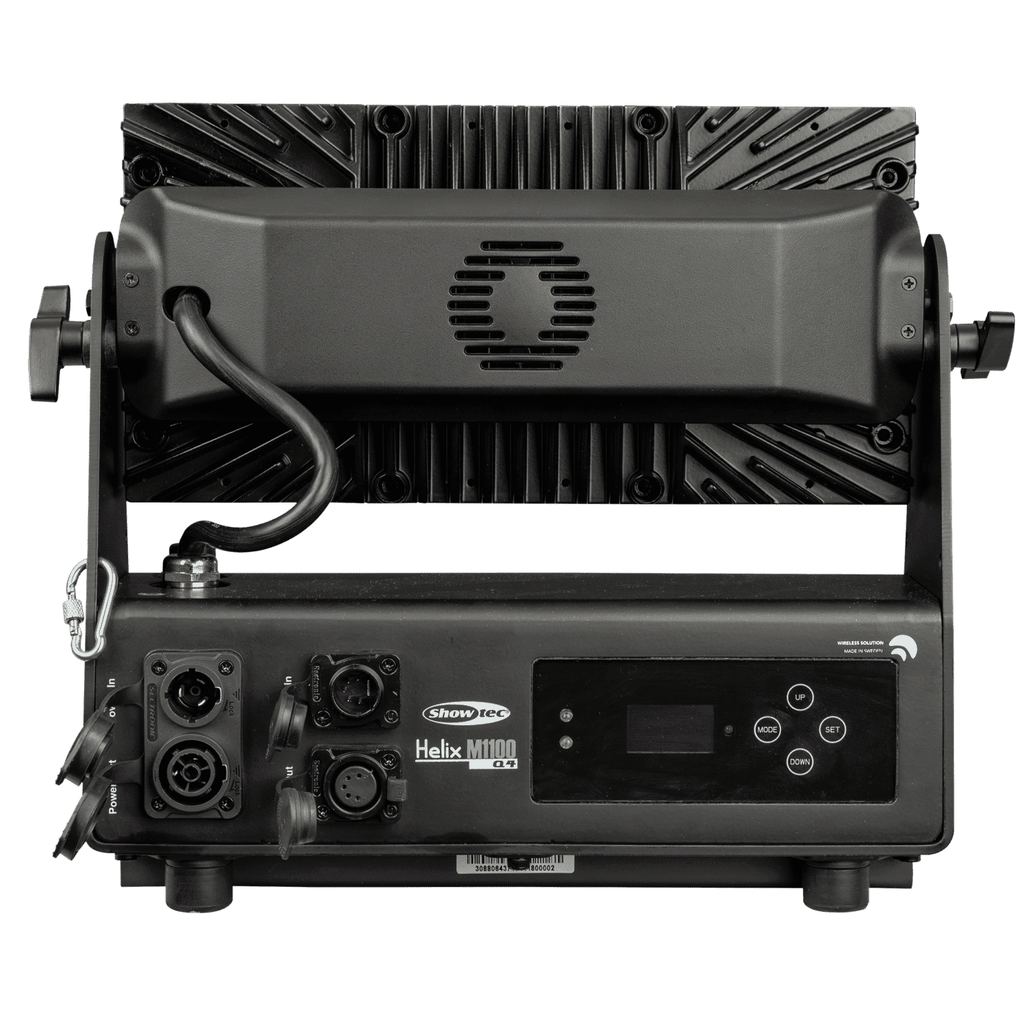 El Showtec Helix M1100 Q4 Mobile es un Wash LED RGBW de 8 × 10 W alimentado por batería y con clasificación IP65, adecuado para aplicaciones móviles de interior y (temporalmente) exterior. Su ángulo beam de 10° se puede ampliar hasta los 20°, 40°, 15° x 60° o 90° mediante unos difusores específicos opcionales. La batería recargable de iones de litio otorga al Helix M1100 Q4 Mobile 15 horas de autonomía. El ángulo de inclinación se puede modificar de forma manual por encima de los 180°; además, la unidad se puede controlar a través de W-DMX (inalámbrico), DMX, maestro/esclavo o del modo manual o automático gracias a los distintos programas que incorpora.