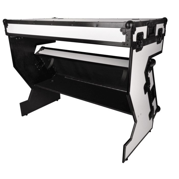 La mesa portátil estilo Z de Showgear es una solución versátil y plegable que se convierte sin problemas en un resistente estuche de transporte. La mesa portátil estilo Z es ideal como mesa de DJ, pero también es muy útil como mesa para consolas de audio e iluminación, e incluso se puede utilizar en ferias y exposiciones. La exclusiva configuración estilo Z de la mesa permite que la mitad de la caja de transporte sirva como una mesa espaciosa, mientras que la otra mitad refuerza las patas y cuenta con un estante utilitario para equipo adicional y almacenamiento. El tablero de la mesa incluye dos orificios para cables que permiten una fácil gestión de los mismos, lo que garantiza así un espacio de trabajo limpio y organizado.