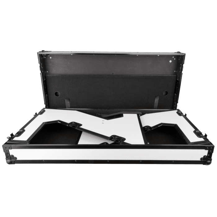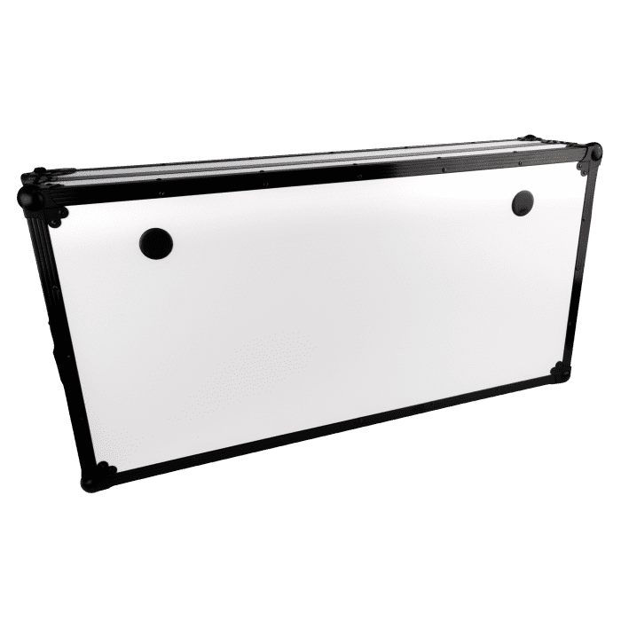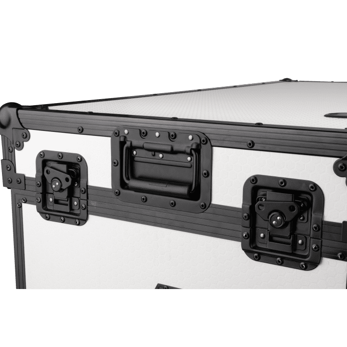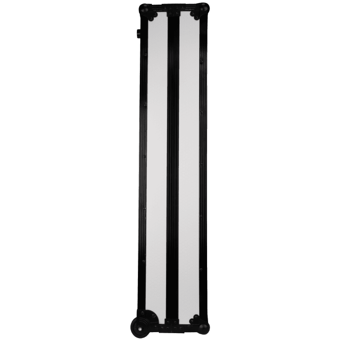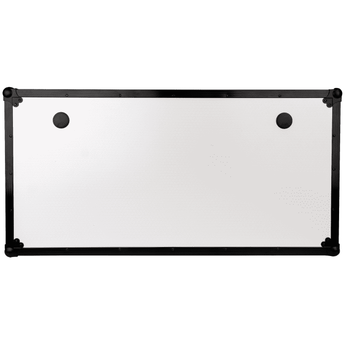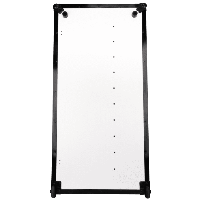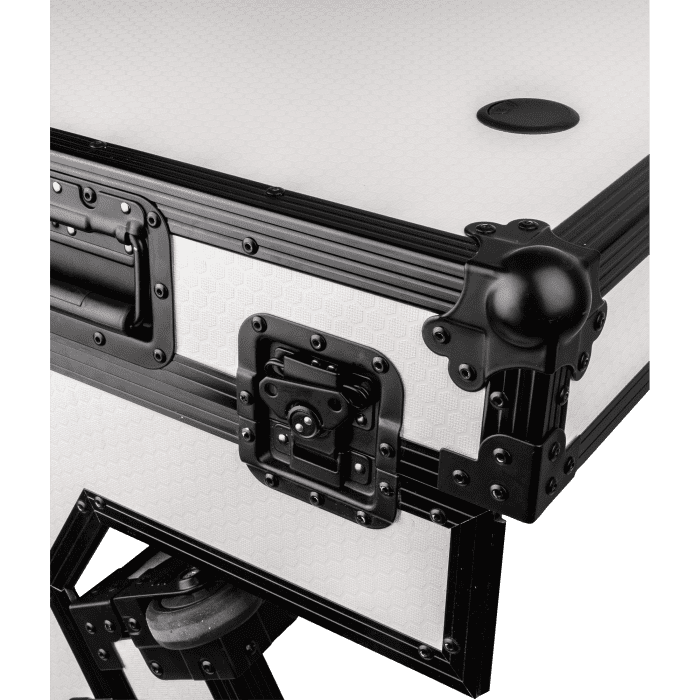 Los lados de la mesa tienen bisagras y se pliegan perfectamente dentro del tablero. Las correas internas de velcro mantienen el estante y los lados firmemente en su lugar durante el transporte, lo que minimiza el movimiento y evita los daños. Una vez instalada, los cierres de mariposa garantizan que la mesa permanezca estable y segura. Para una movilidad sin esfuerzo, la mesa portátil estilo Z de Showgear está equipada con dos ruedas integradas y manijas dobles en cada extremo, lo que hace que sea fácil de transportar e instalar allá adonde vaya.