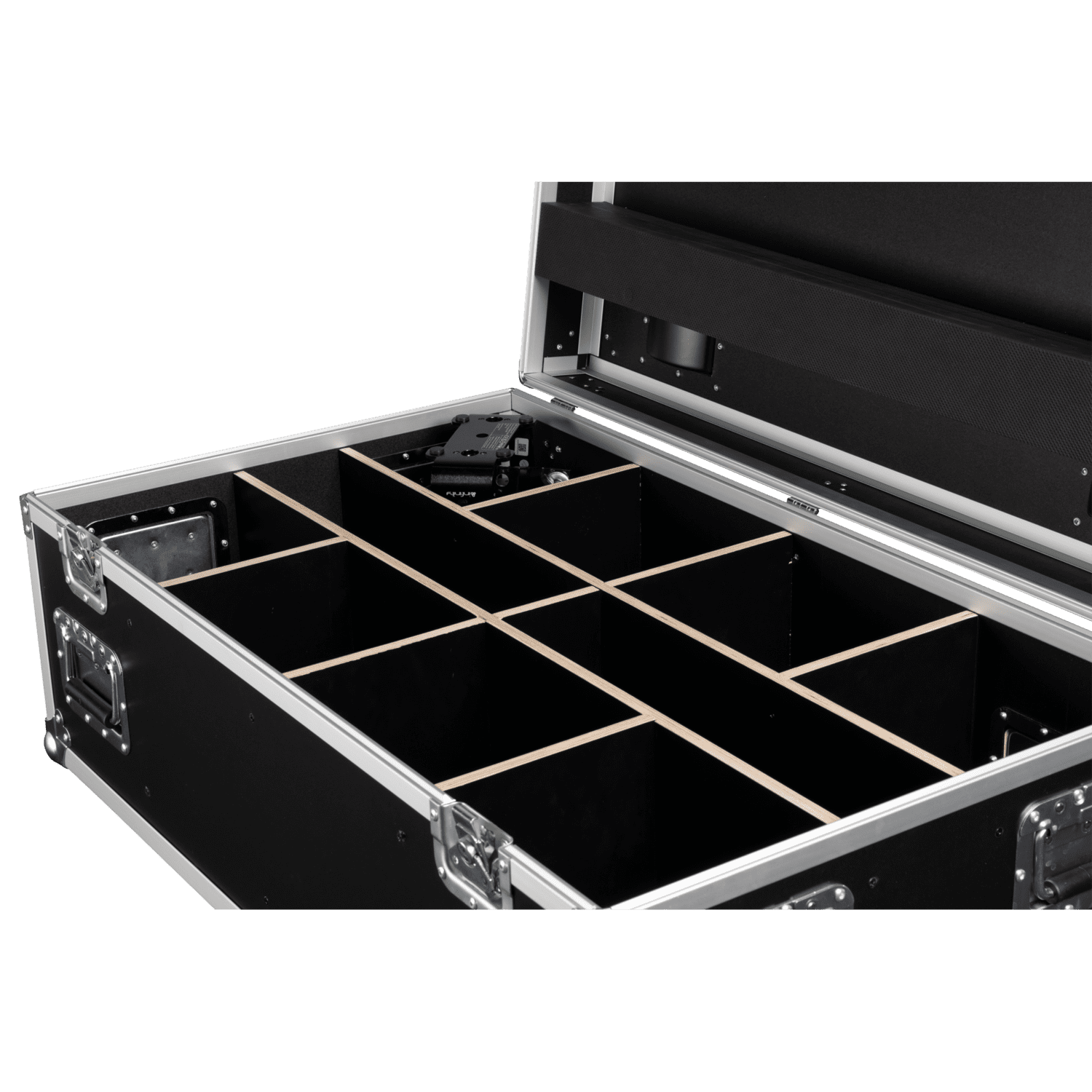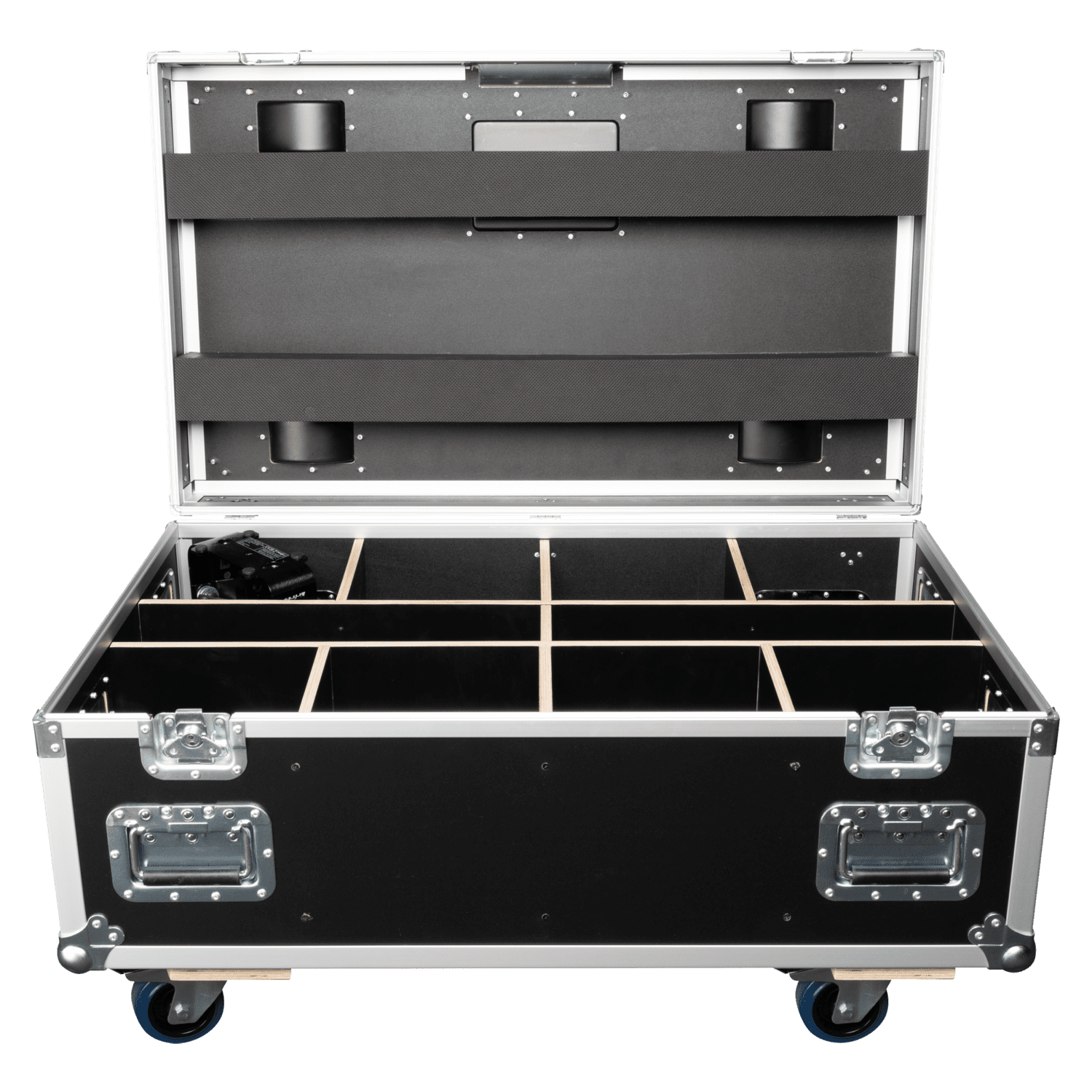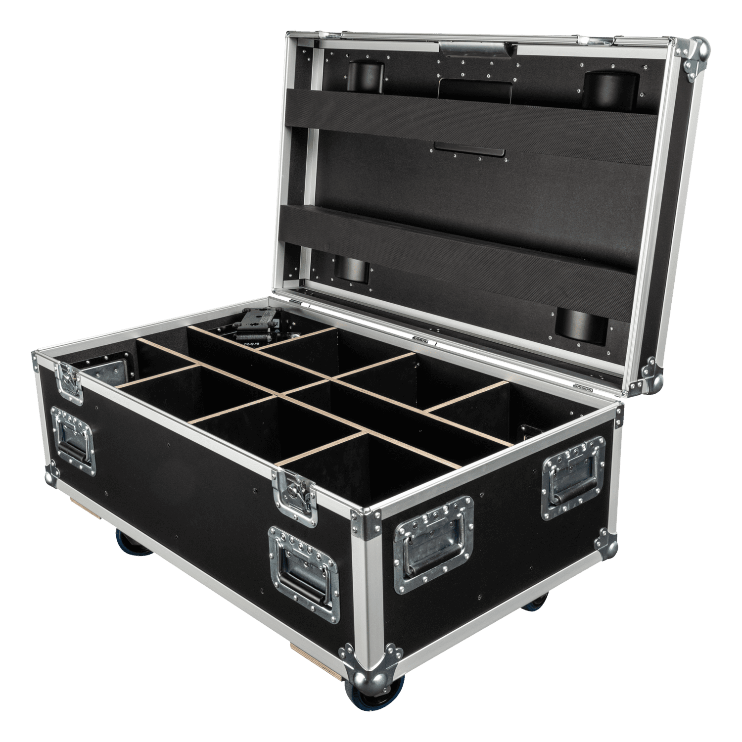 La solución Infinity Case para ocho dispositivos Raccoon Junior P7/4 es una caja de transporte específica para ocho dispositivos Infinity Raccoon Junior P7/4. Dispone de un compartimento para accesorios como cables y abrazaderas, y utiliza madera contrachapada de 9 mm de alta calidad con cierres y asa Penn-Elcom. El interior de espuma mecanizada por CNC mantiene los pares Raccoon y los accesorios seguros durante el transporte y el almacenamiento, lo que proporciona la combinación que todo rigger y empresa de alquiler solicita. El maletín está equipado con cuatro ruedas giratorias con frenos para facilitar su maniobrabilidad. Dispone de cuatro bases de apilamiento que permiten agrupar varias cajas de transporte de forma segura sin riesgo de que se desplacen o rueden. Contiene una base portaetiquetas de viaje para una identificación clara en la carretera.