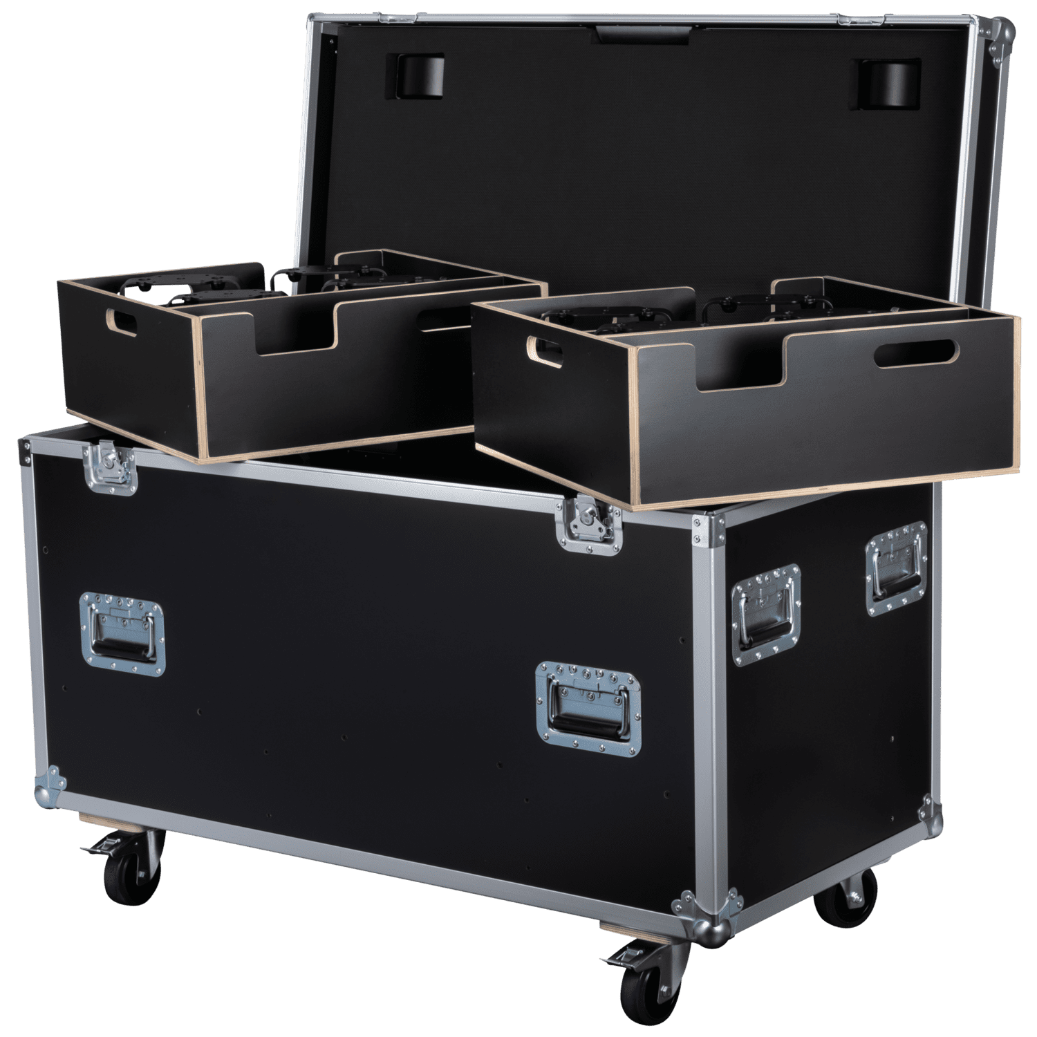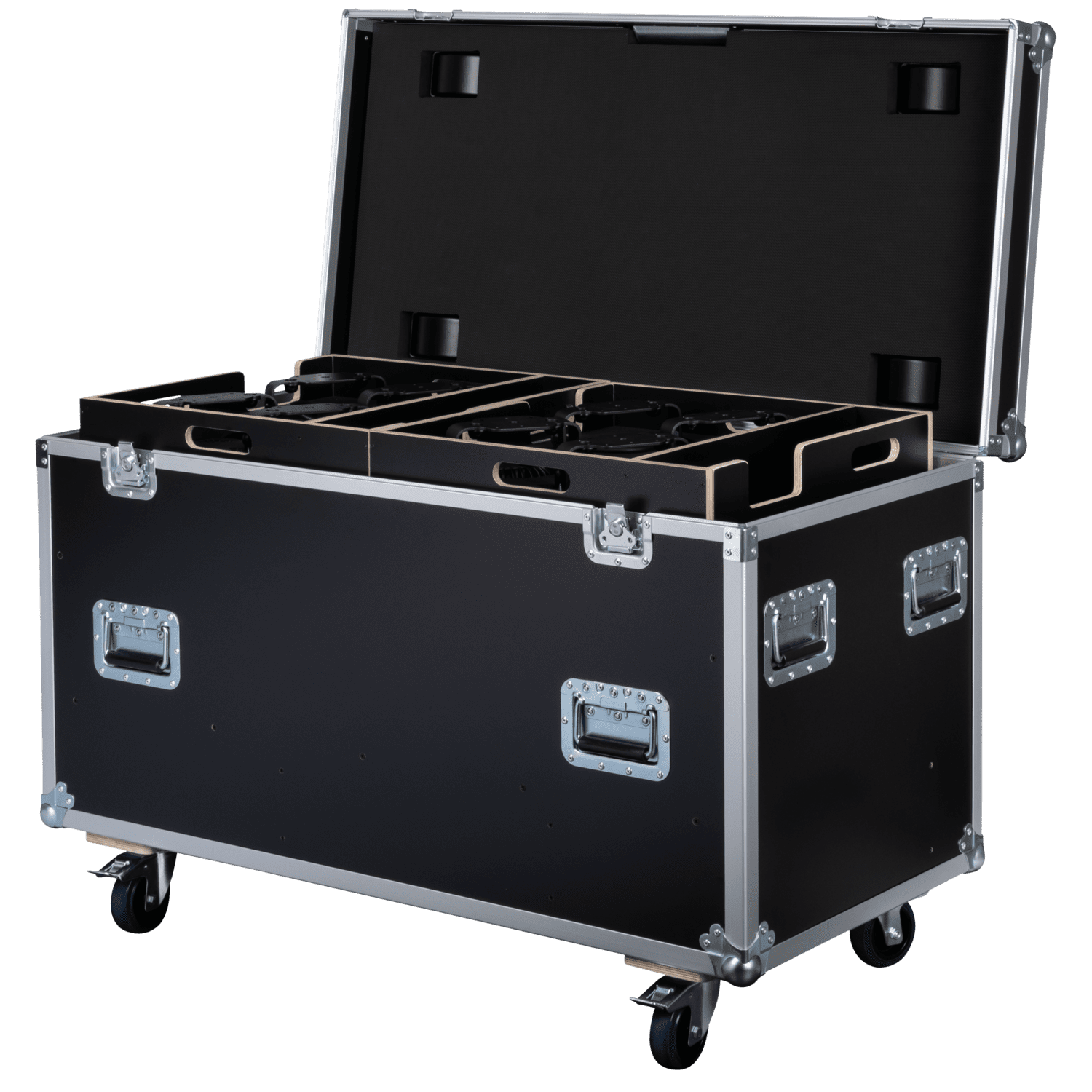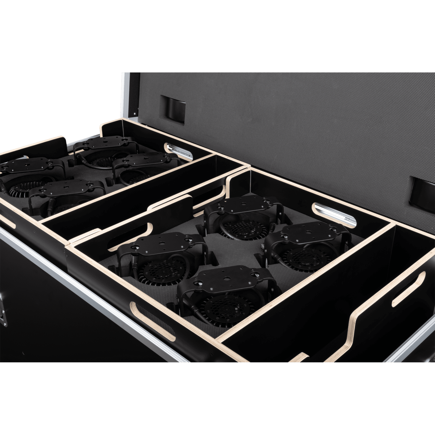 El Showtec Case para 2 Stage Blinder FLEX Blaze/Titan Strobe FLEX FX es una caja de transporte específica para dos juegos completos del Showtec Stage Blinder FLEX Blaze o el Showtec Titan Strobe FLEX FX. El interior de espuma preformada mantiene las 16 cápsulas, los dos controladores y todos los cables y herrajes seguros y protegidos durante el transporte y el almacenamiento.