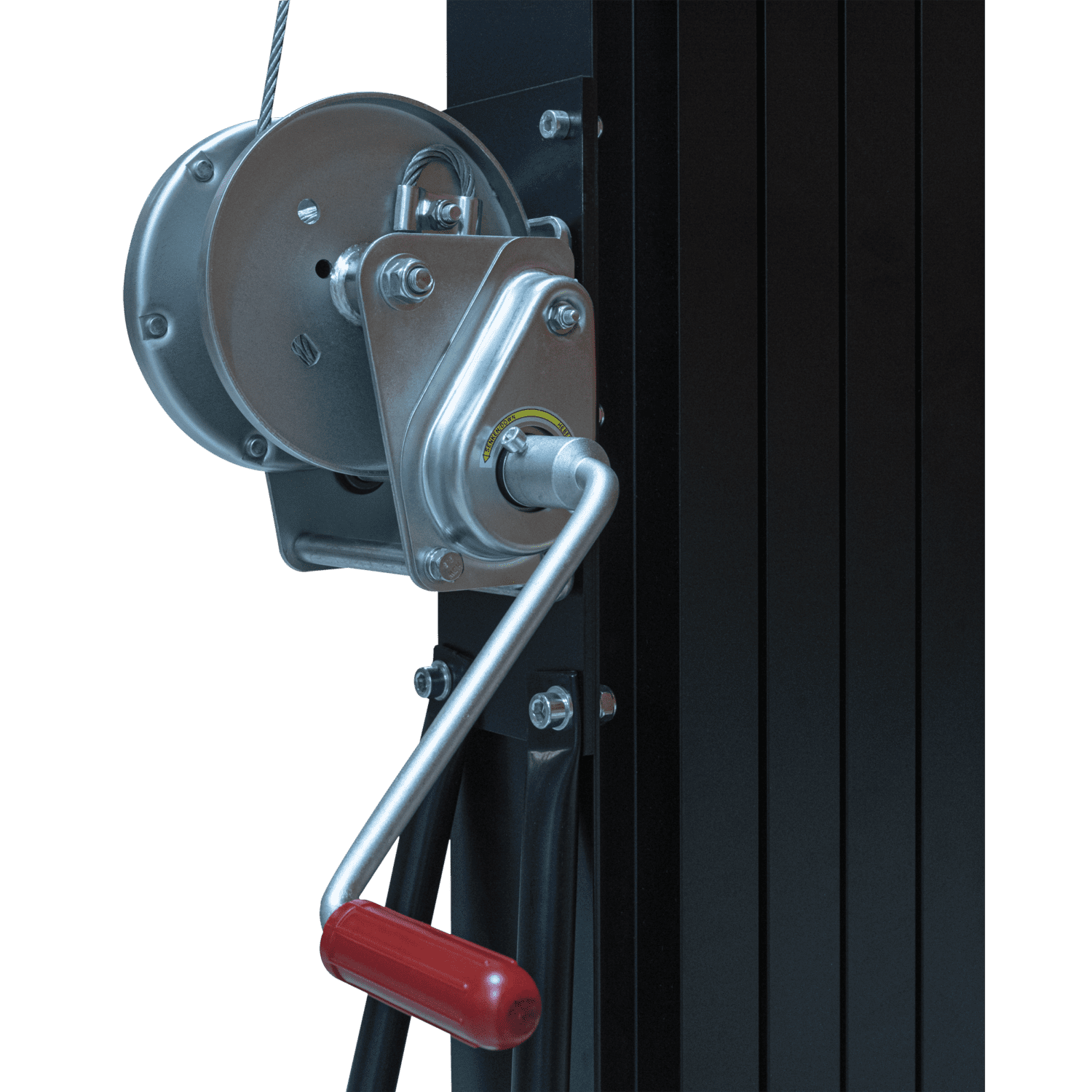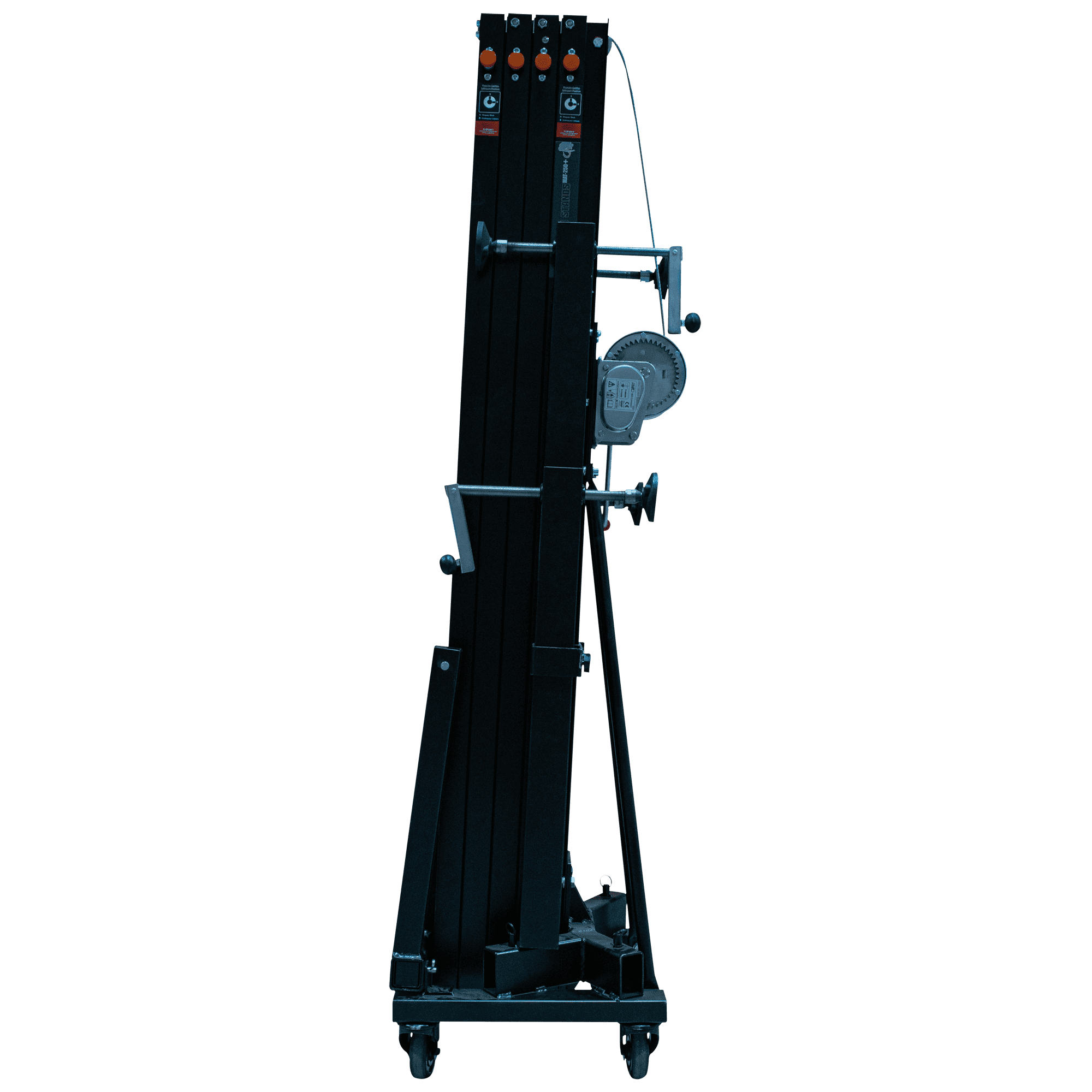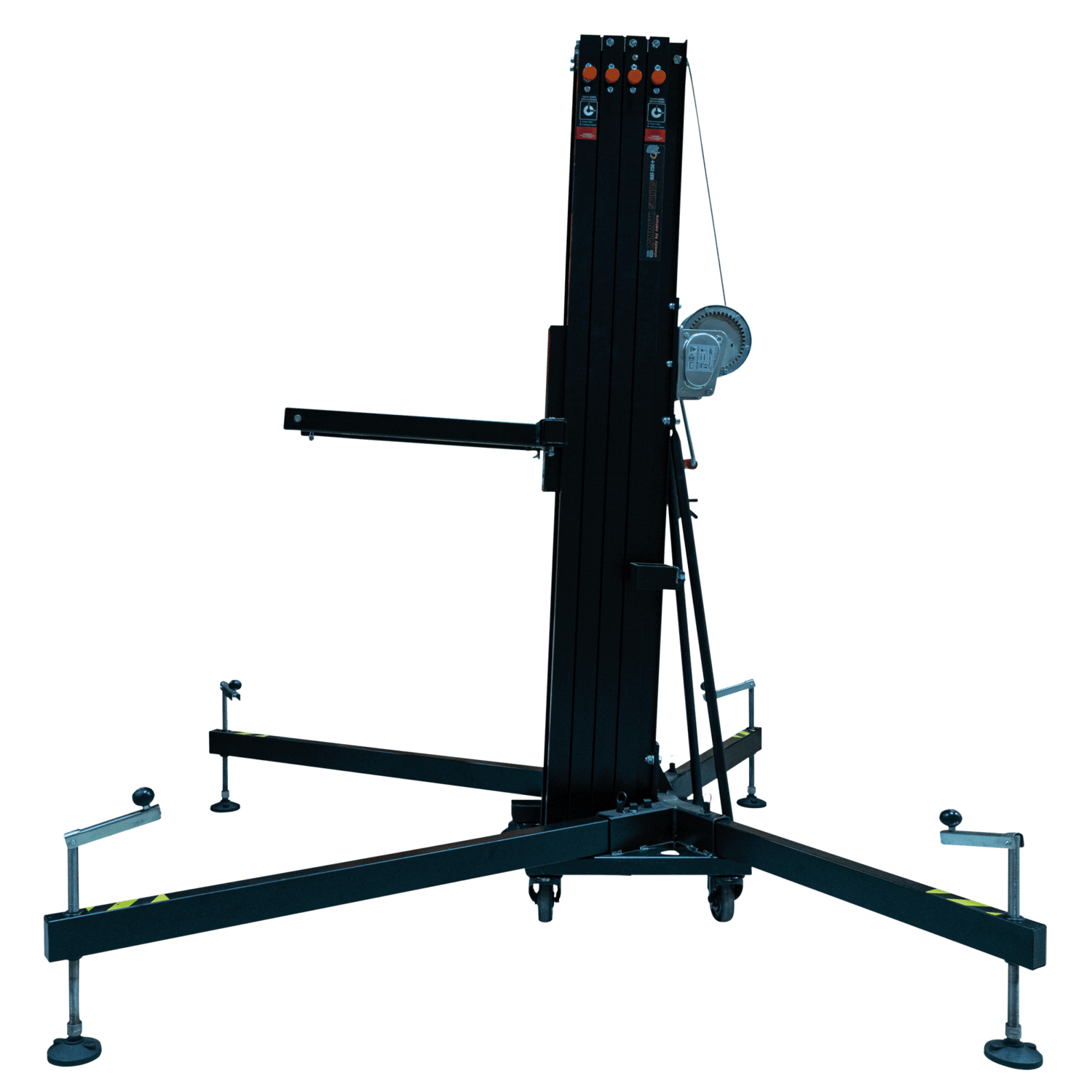 Esta torre elevadora compacta de carga frontal es ideal para alzar sistemas line array, truss y pantallas LED. Sus dimensiones compactas facilitan su transporte incluso en furgonetas de menor tamaño. También permiten un montaje del equipo más ergonómico. A pesar de su tamaño reducido, puede elevar cargas de hasta 250 kg hasta una altura de 6,5 metros. Al elevar las cargas directamente del suelo, el esfuerzo del usuario se reduce al mínimo. Las características de seguridad incluyen una base reforzada, un sistema de bloqueo automático de las patas, pasadores de seguridad y una burbuja circular que ayuda a nivelar la torre para conseguir una estabilidad óptima.