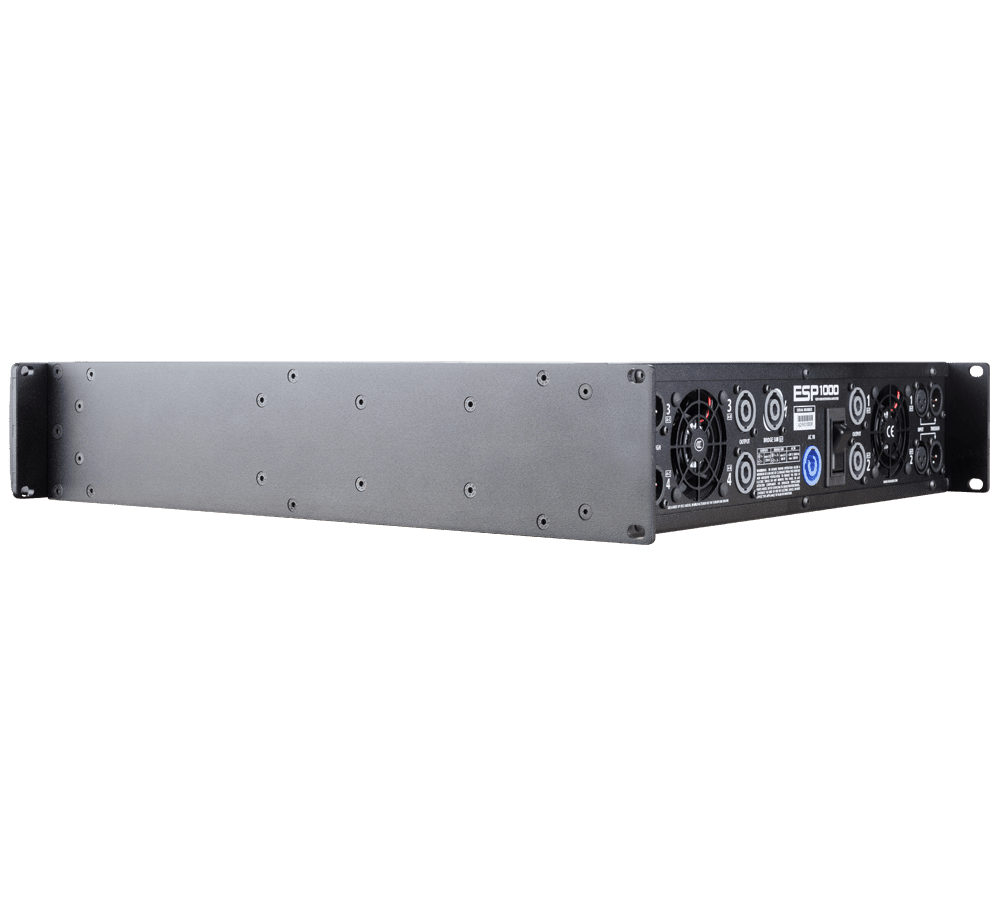 The ESP1000 will mount in a standard 19″ rack system. Integral rear mounting rack ears are also provided for additional support. It is important that you do not rely on fixing and mounting the ESP1000 using just the front panel as the support. Use eight screws and washers to mount the amplifier to the equipment rack rails, (four for the fronts and four for the rear).