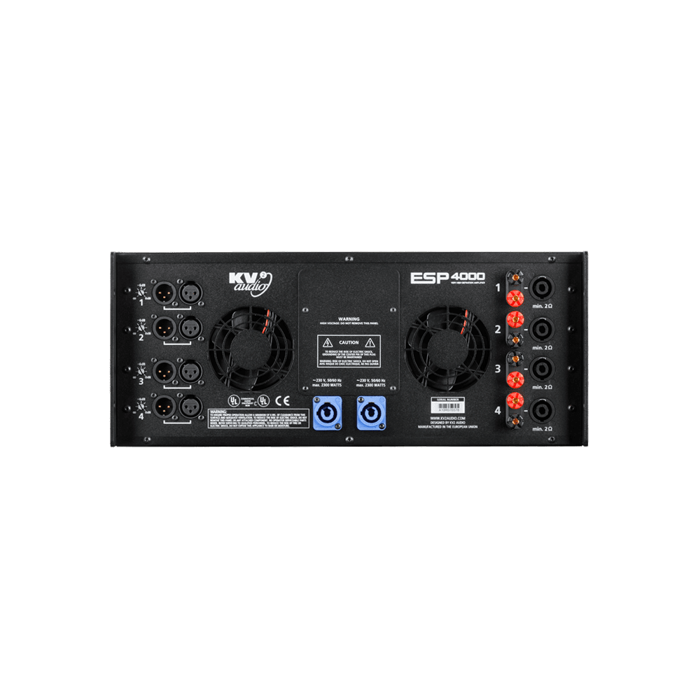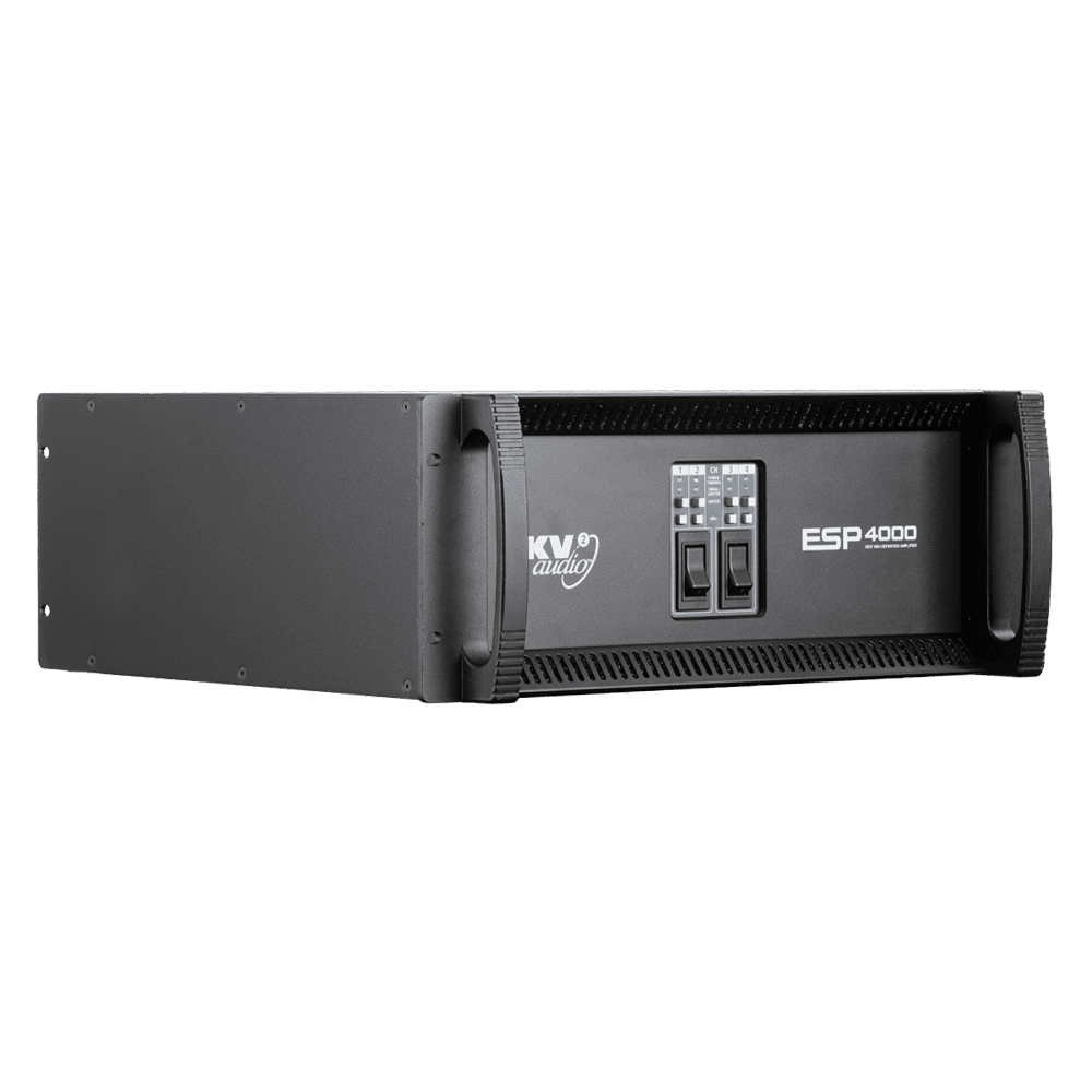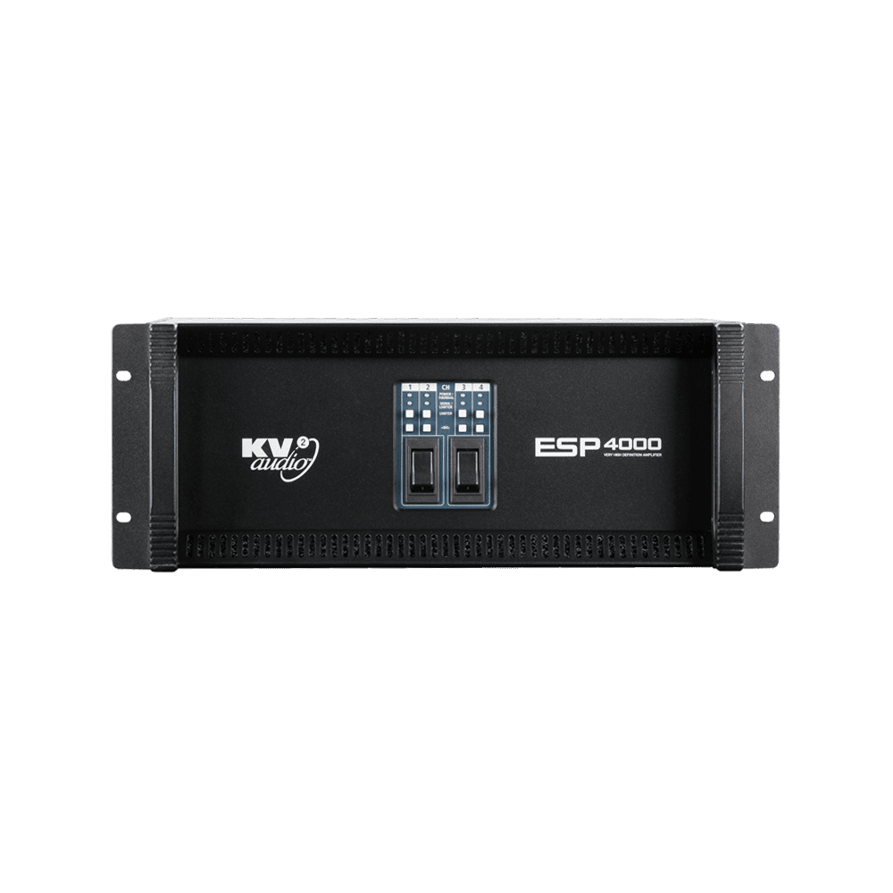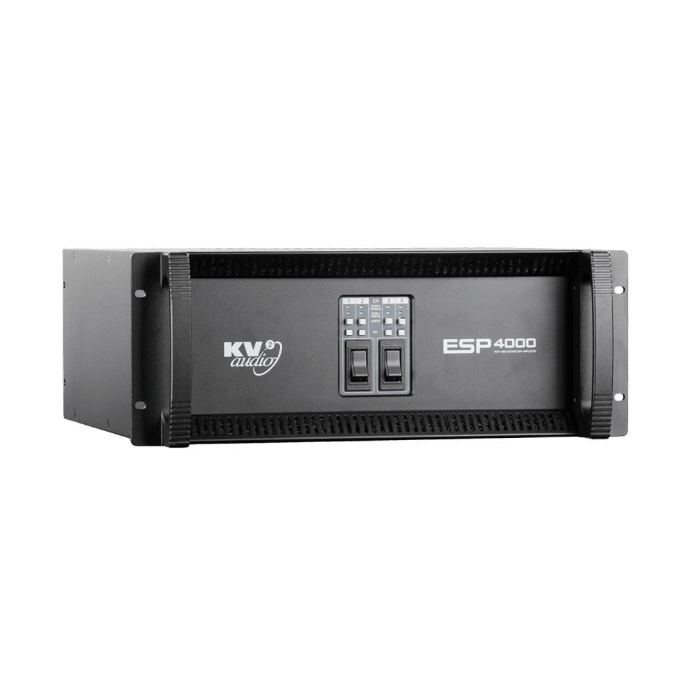The ESP4000 is an ultra high definition 4 channel rack mountable power amplifier from KV2 Audio, specifically designed for optimised performance with ESD loudspeakers, as well as with other passive systems. For the ESP4000 all electronic circuit boards are first mounted on individual aluminium heat sinks, then on a secondary, internally sealed chassis, this leaves only the heatsink fins exposed. Two separate power supplies ensure increased reliability and continuous delivery of full power. Two shock mounted fans move air across the fins but never directly across the electronic components. This minimises maintenance cycles and improves the components lifespan and and reliability. The ESP4000 is housed in a professional 4U road rugged steel metal case with aluminium handles and evenly distributed weight.