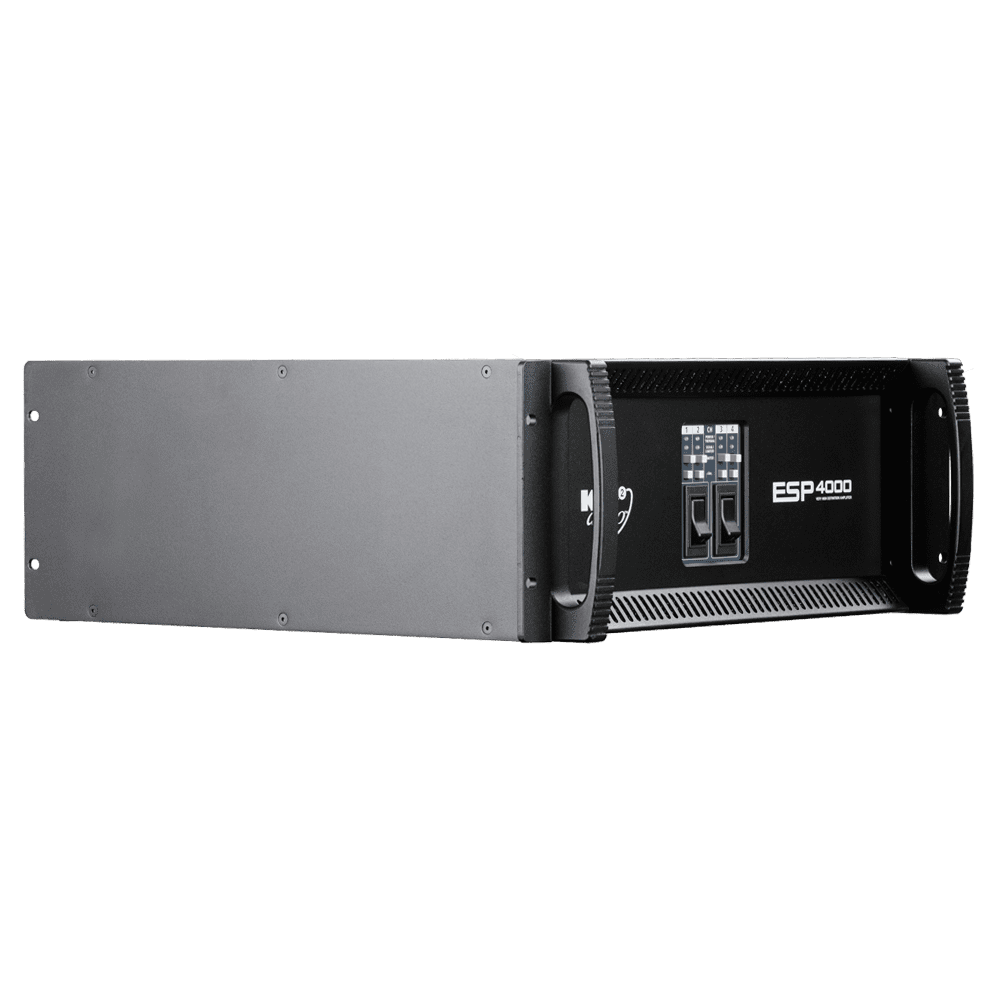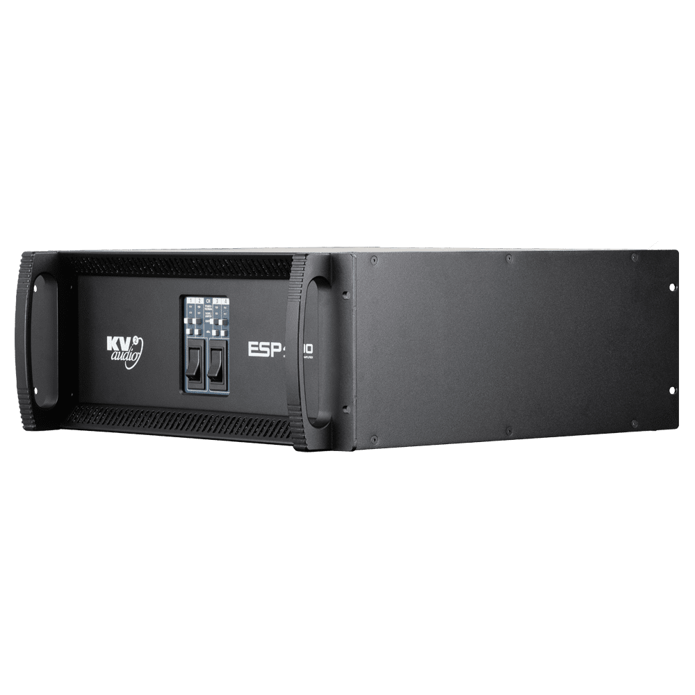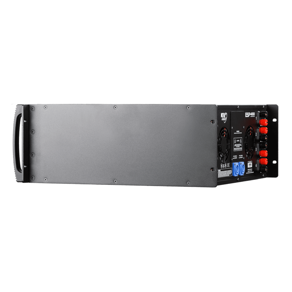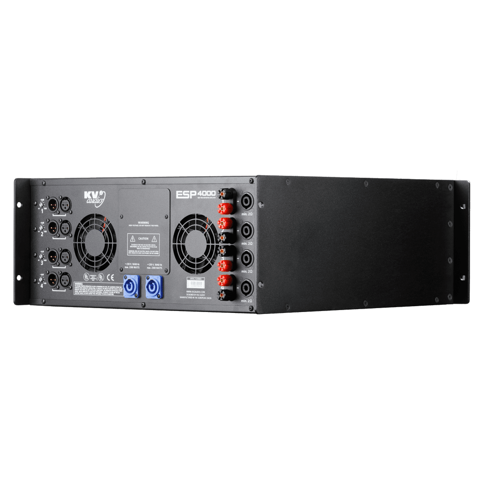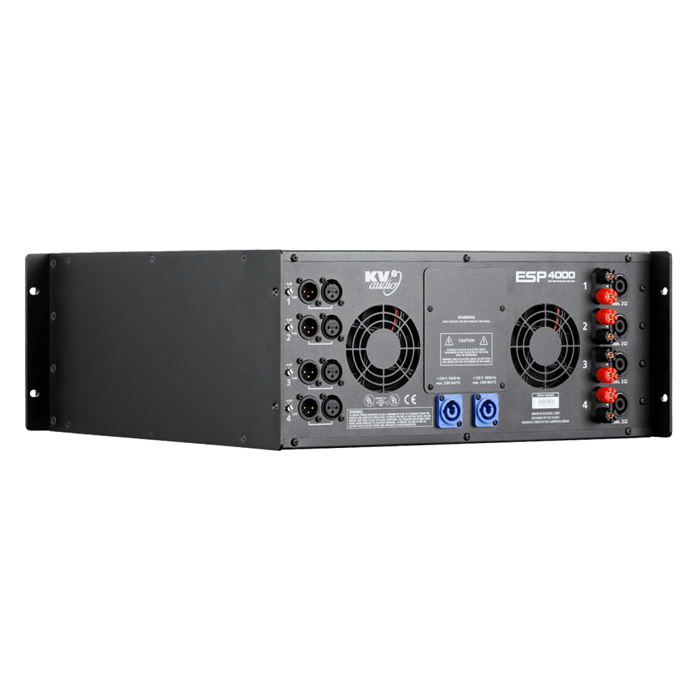 The ESP4000 is an ultra high definition 4 channel rack mountable power amplifier from KV2 Audio, specifically designed for optimised performance with ESD loudspeakers, as well as with other passive systems. For the ESP4000 all electronic circuit boards are first mounted on individual aluminium heat sinks, then on a secondary, internally sealed chassis, this leaves only the heatsink fins exposed. Two separate power supplies ensure increased reliability and continuous delivery of full power. Two shock mounted fans move air across the fins but never directly across the electronic components. This minimises maintenance cycles and improves the components lifespan and and reliability. The ESP4000 is housed in a professional 4U road rugged steel metal case with aluminium handles and evenly distributed weight.