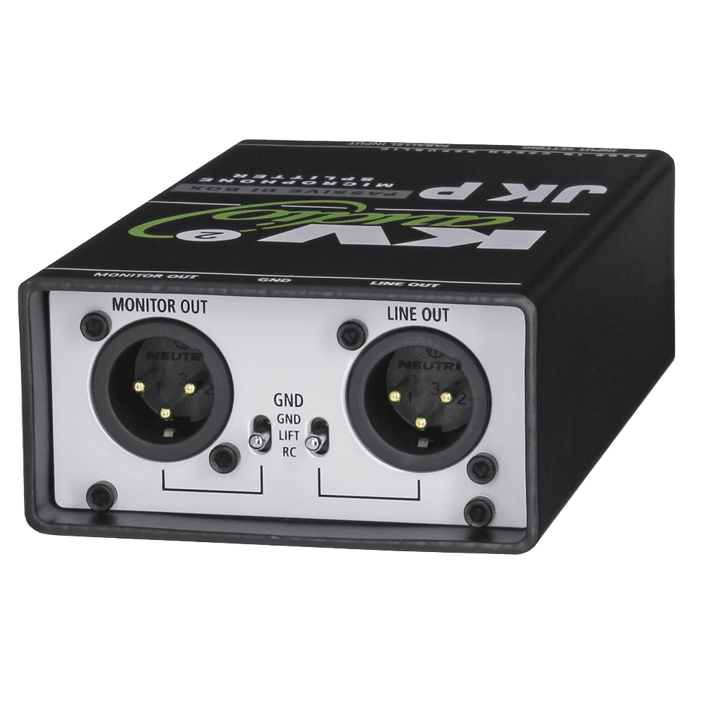 The JKP serves as a universal passive DI box with low output impedance. The JKP features one XLR input and two 1/4″ jack inputs in parallel. The JKP is designed for multiple instrument connection such as keyboards, guitars or instrument amplifiers direct output. The JKP also features phantom power supply pass-through for condenser microphone connection and output signal Line Driving.