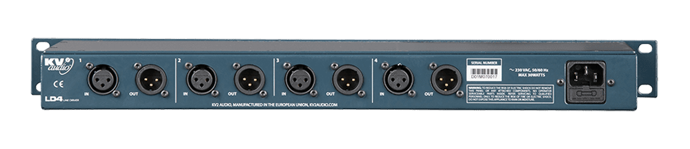 The VHD LD4 is a four channel line driver designed to maintain audio signal integrity over long cable lengths. As cable lengths between mixers and amplifiers increase, the length of the cable creates a high capacitance load that many mixers have difficulty in driving. The LD4 eliminates standing waves and signal impurities resulting in the delivery of a high quality audio signal no matter what the cable length. The VHD LD4 was built as a part of KV2 Audio’s VHD product philosophy focused on delivering very high definition audio. Each channel features an individual transformer based power supply with insulated grounding. Circuitry is designed to provide excellent resolution of signal with very high dynamic content as found in live sound applications.