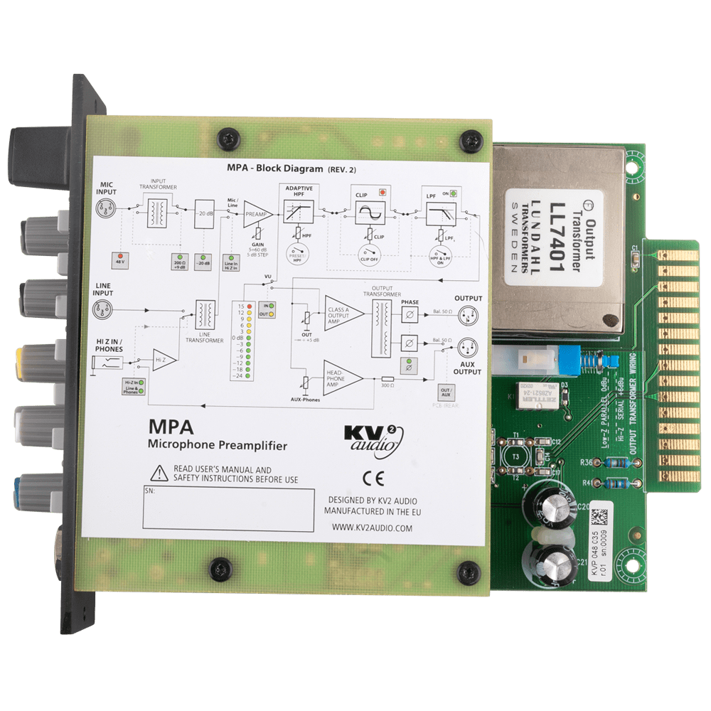 The MPA is a Very High Definition microphone and musical instrument preamplifier with Class-A circuitry and a high quality transformer balanced output. A stepped Input gain selector is provided for easy and precise repeatability of settings. The preamplifier features adjustable high and low pass filters, with an adjustable limiter to control clip level and a transformer isolated high impedance line input. It also has a further auxiliary transformer balanced isolated output meaning a number of these units can be used together to make a multi-channel stage preamp, for splitting FOH and monitoring outputs, or for broadcast and recording duties -delivering them all through line drivers in pristine audio quality. Phase reverse and an in-built headphone amplifier, which doubles up as a third output, completes the feature rich unit. With the exceptional quality of all KV2’s analog outboard electronics, the MPA can replace a preamplifier, Di-box/Splitter, line driver and headphone amplifier all in one box.