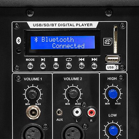 El altavoz también cuenta con un lector de tarjetas USB/SD integrado, que facilita la reproducción directa de archivos de audio. El ecualizador de 2 bandas permite un ajuste preciso del sonido, mientras que sus múltiples opciones de conexión, como una entrada de micrófono XLR, una entrada de línea XLR/RCA o jack de 3,5 mm y una salida de línea XLR, hacen que este altavoz sea extremadamente versátil para diversas configuraciones de audio.
