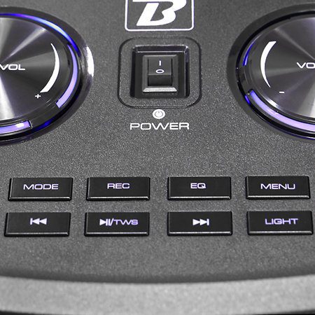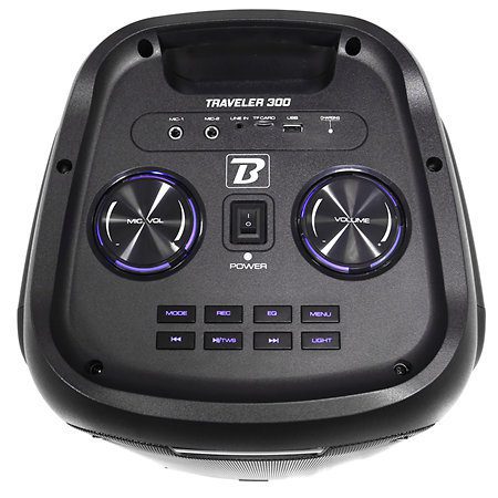 El BoomTone DJ Traveler 300 es un sistema de sonido portátil con batería recargable y LED integrados, un puerto USB/SD para reproducir archivos de audio digitales desde medios (dispositivo, tarjeta), un sintonizador de radio y un receptor Bluetooth para transmisión de audio.