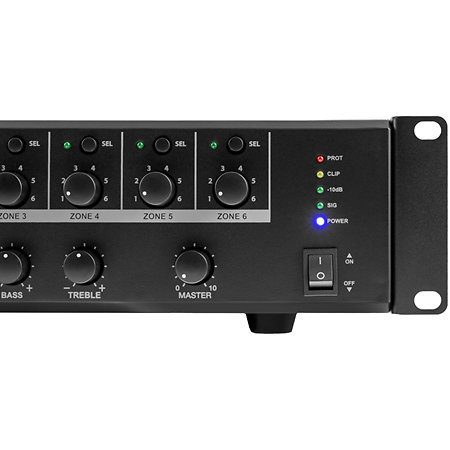 Diseñado para aplicaciones que requieren gestión de audio multizona, este mezclador amplificador integra 6 entradas, incluyendo 4 de micrófono/línea con prioridad de micrófono y alimentación fantasma, además de 2 entradas de línea RCA/jack de 6,35 mm, lo que garantiza una amplia conectividad con diversas fuentes de audio.