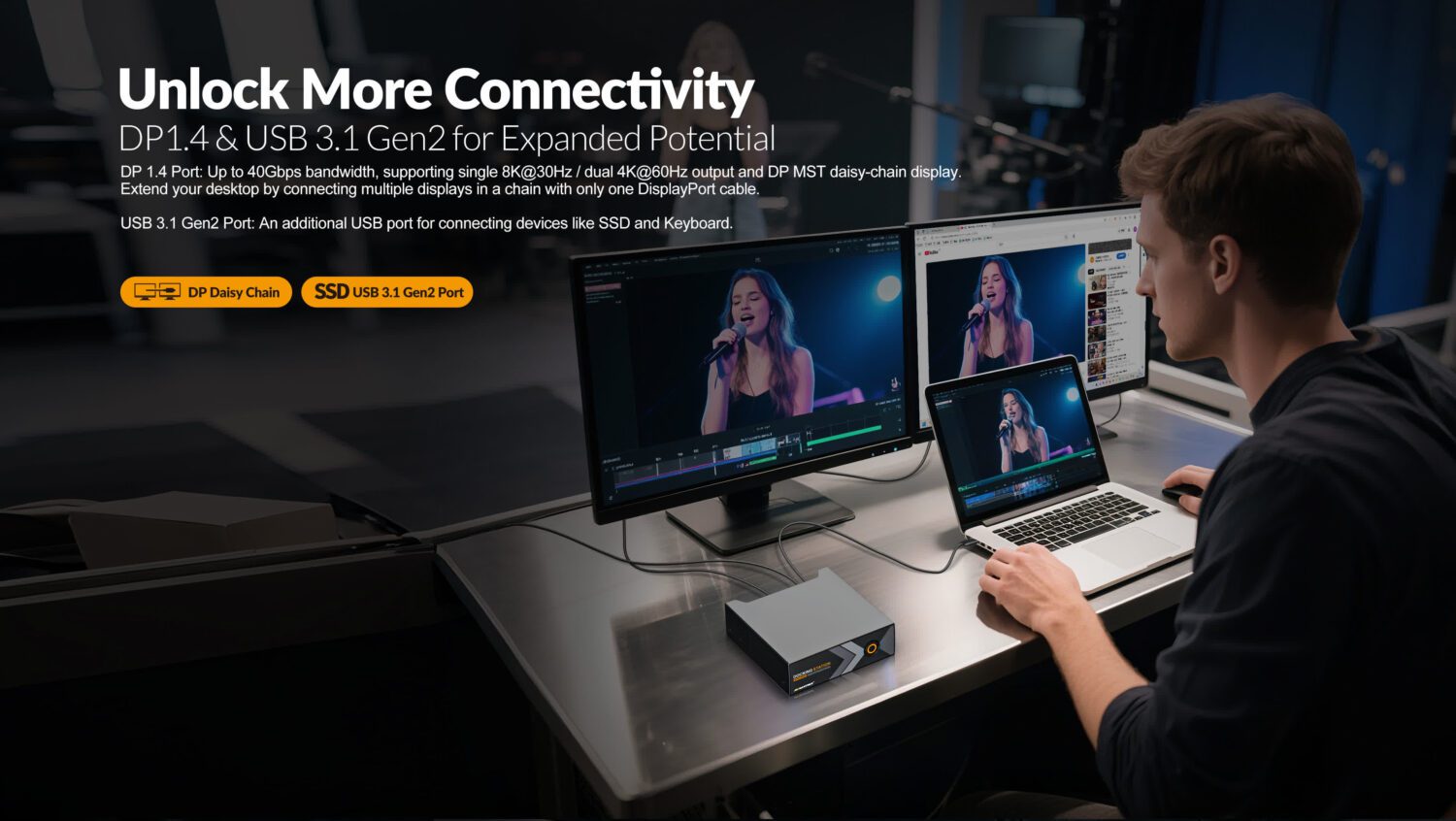 • Interfaz de computadora extendida, interfaz USB3.1 Gen2 10 Gbps, interfaz DP1.4 4 * 8 Gbps (compatible con la plataforma Windows DP MST con conexión en cadena)