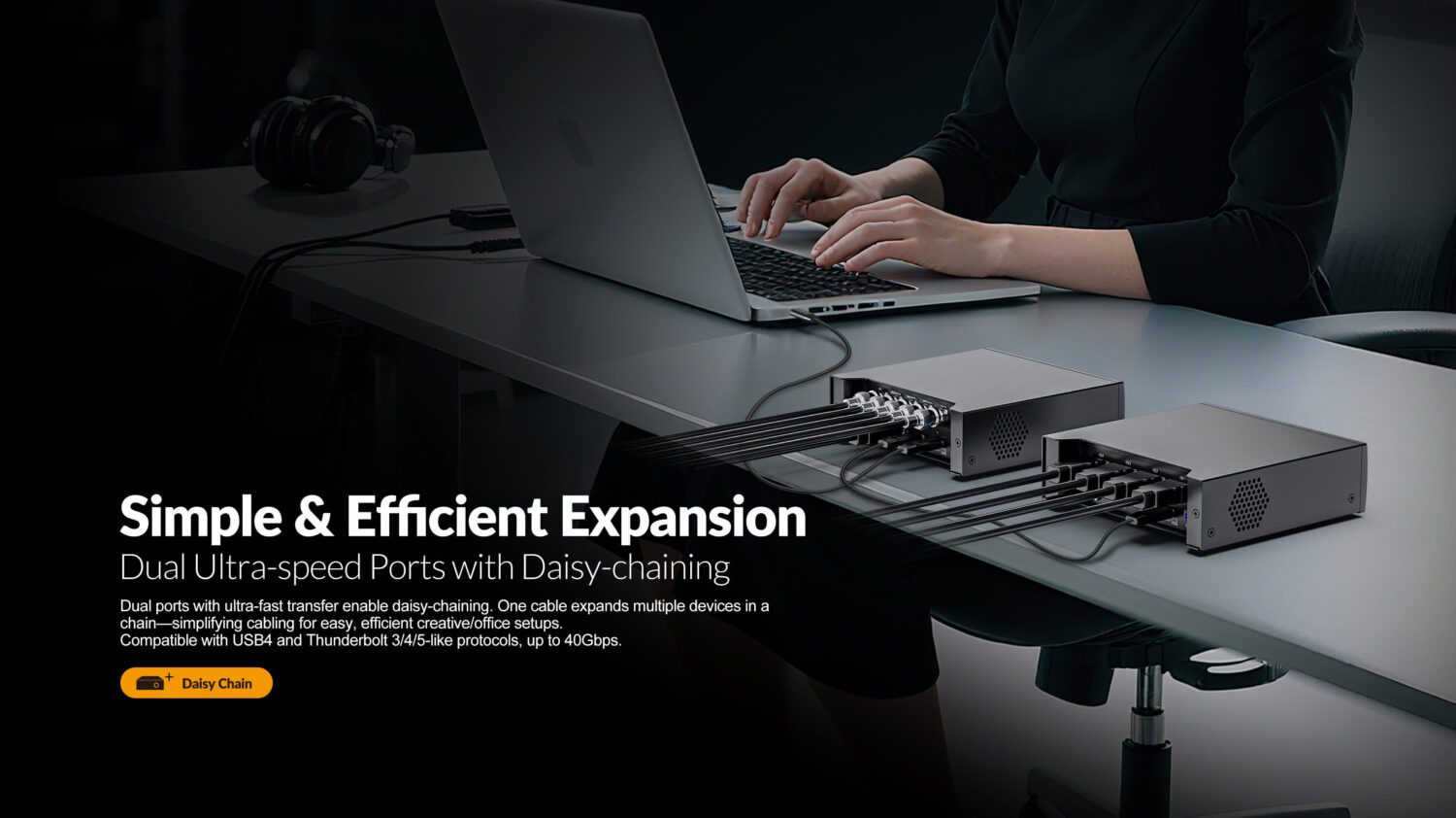 • Puerto dual ultrarrápido, la velocidad más alta hasta 40 Gbps, soporte para conexión en cadena