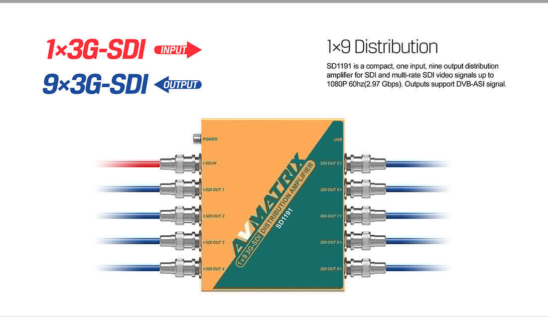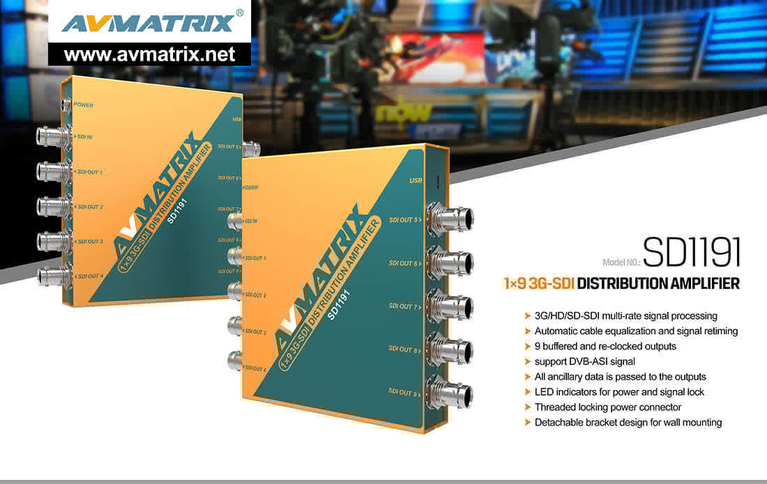 El SD1191 es un distribuidor amplificador miniatura 1×9 con resincronización 3G/HD/3G-SDI. La señal de entrada SD/HD/3G-SDI se detecta automáticamente. Incorpora técnicas de ecualización y resincronización de cable que permiten una distancia de cable SDI de hasta 400 m (SD), 200 m (HD) y 120 m (3G). Además, es un distribuidor amplificador ASI con todas las entradas y salidas compatibles con la señal ASI.