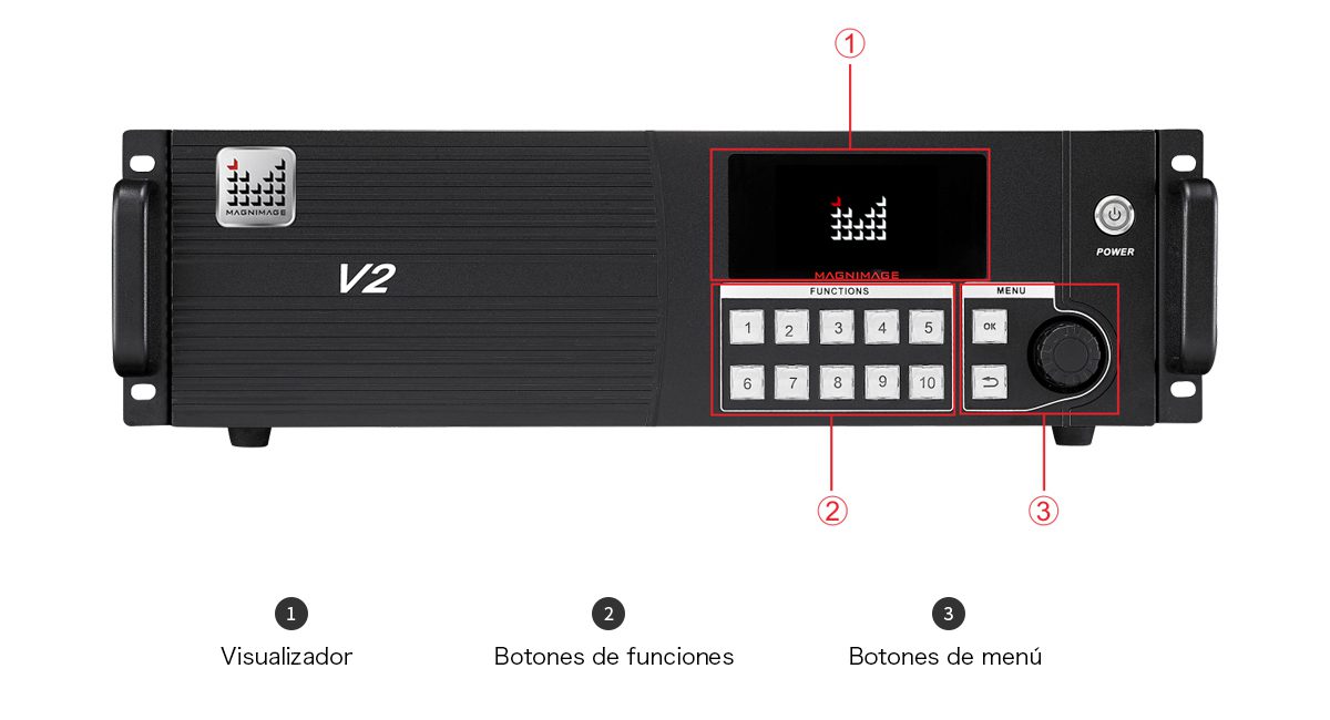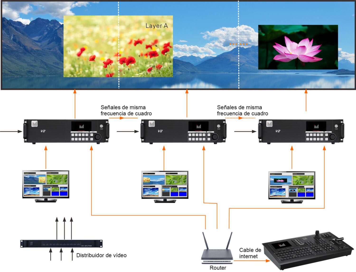 Usa distribuidor de vídeo puede transmitir señales a dos V2, se divide en grupos, puede conectarse múltiples V2, con que realizan juntamiento de cabinets, cambio de imágenes de múltiples unidades fácilmente