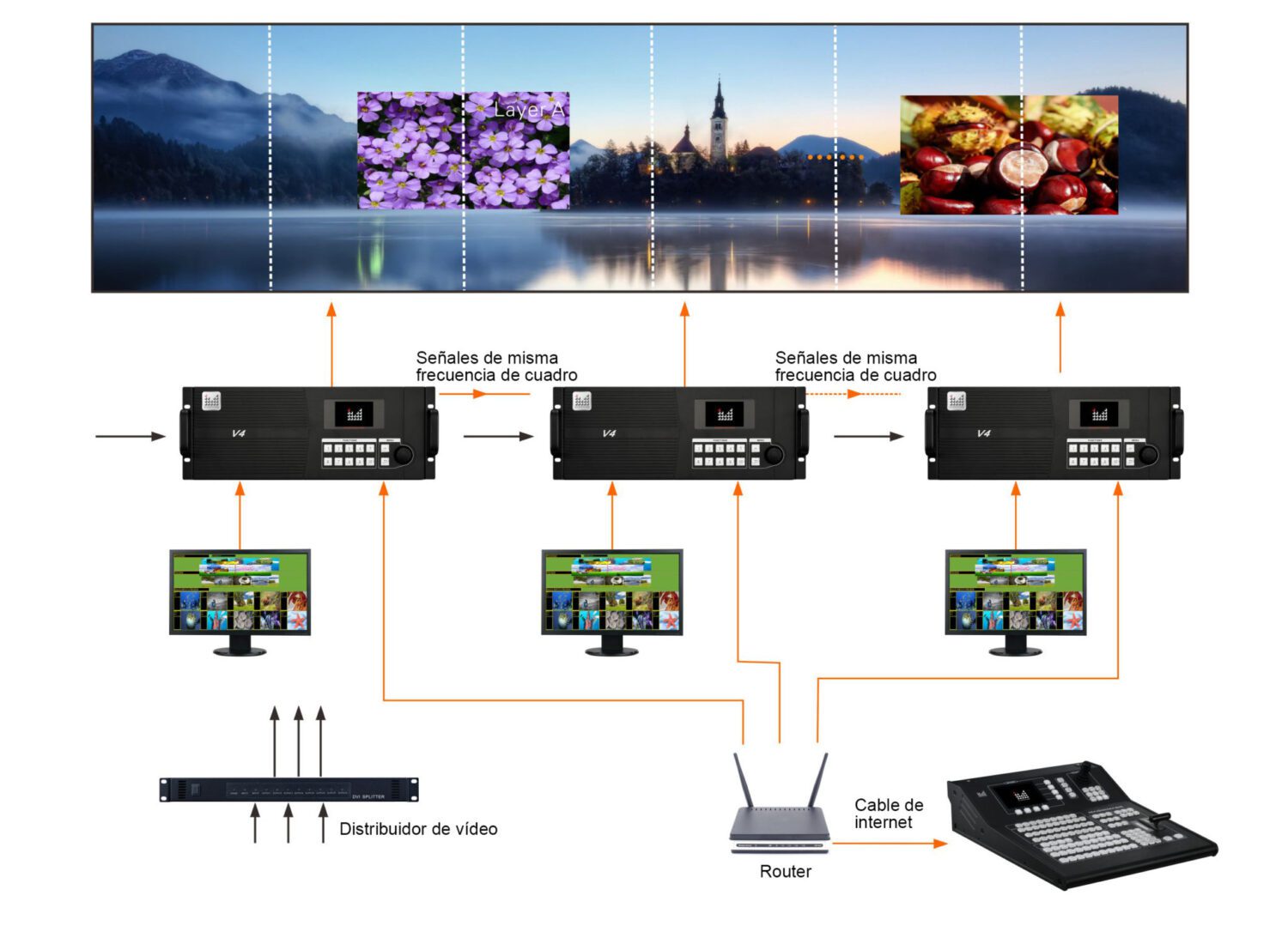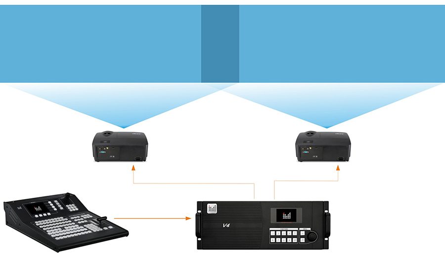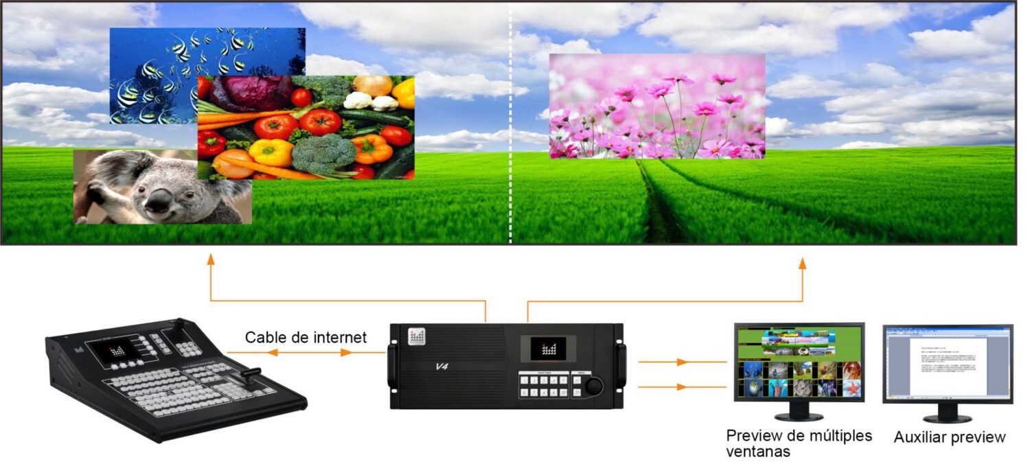 Usa distribuidor de vídeo para distribuir las señales a dos precesadores, y se divide en dos grupos.Por medio de cambiar procesador, pueden conectarse múltiples procesadores, con que puede ajustar y guardar los datos,guardar y cargar modelos en múltiples unidades al mismo tiempo, realizan cambio de imágenes de múltiples unidades fácilmente
