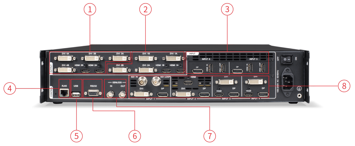 Salida: 12 puertos divididos en 2 grupos, cada grupo incluye 4 × DVI (copia A B para copia de seguridad, 1A = 1B, 2A = 2B) y 2 × HDMI (copia A B para copia de seguridad); Los puertos DVI o HDMI están disponibles para su uso.