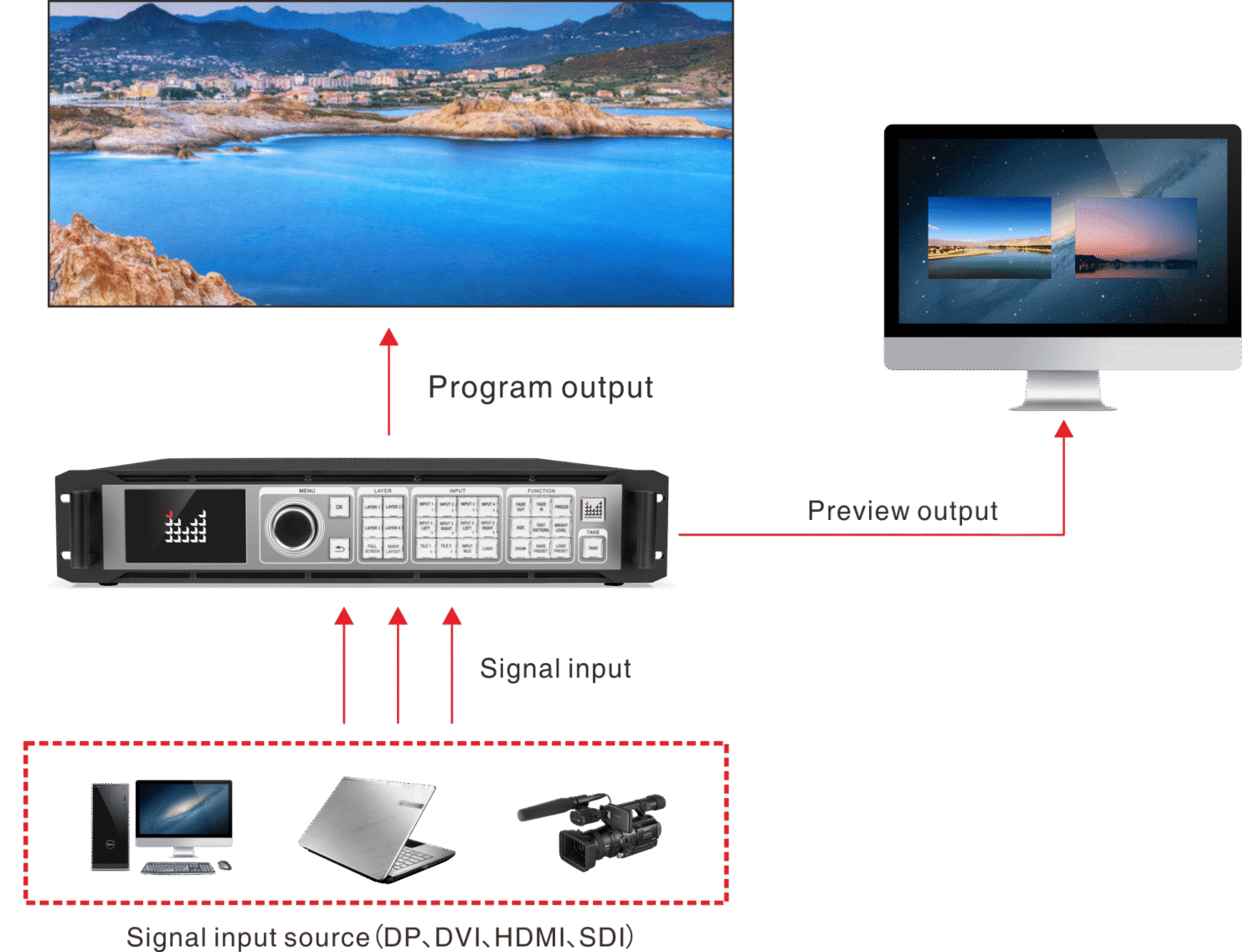 Puertos de entrada de video incluyen SDI x 1, DVI x4, HDMI x3, DP x4, y también le permite extender 2 entradas más DP1.2 / HDM2.0. Es compatible con Internet, USB y control RS232 para enlazar con varios equipos de video.