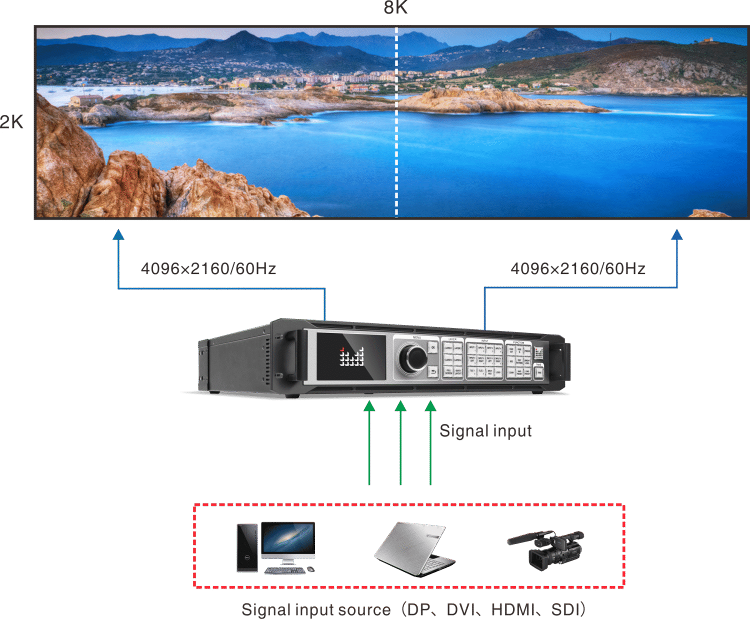 La serie MAG.W4000.2DH es un procesador de video de 8K x 2K que integra múltiples funciones, como mosaicos, interruptores y pantallas de múltiples ventanas. Este procesador integra varios puertos de entrada profesionales, admite una sola entrada como máximo 4Kx2K / 60Hz o 8Kx 1K / 60Hz. Debido a las imágenes de alta calidad, es ampliamente utilizado en exposiciones, conferencias de negocios, representaciones teatrales, teatros y estaciones de TV, etc.