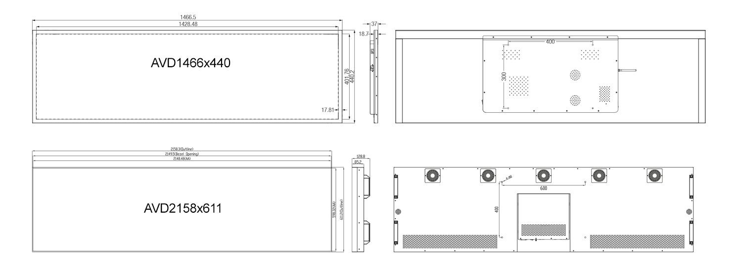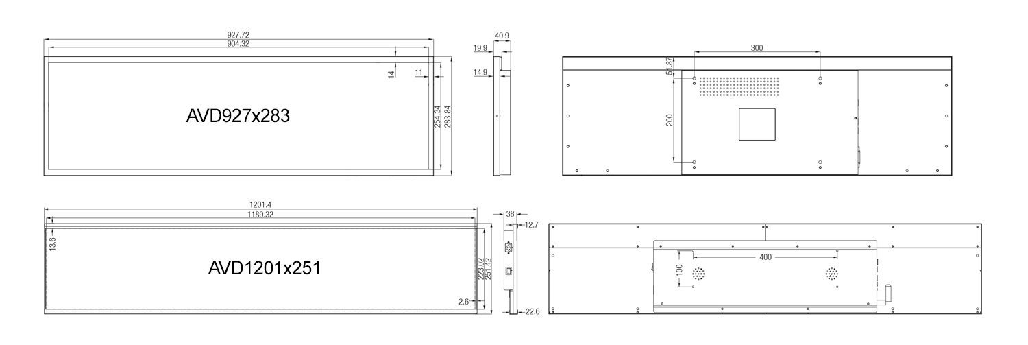 | Active Display Area | 597.89(H) x 112.1(V)mm | 705.6(H) x 198.45(V)mm | 919.3 (H) x 138.85 (V) mm | 904.32(H) x 254.34(V)mm | ||||