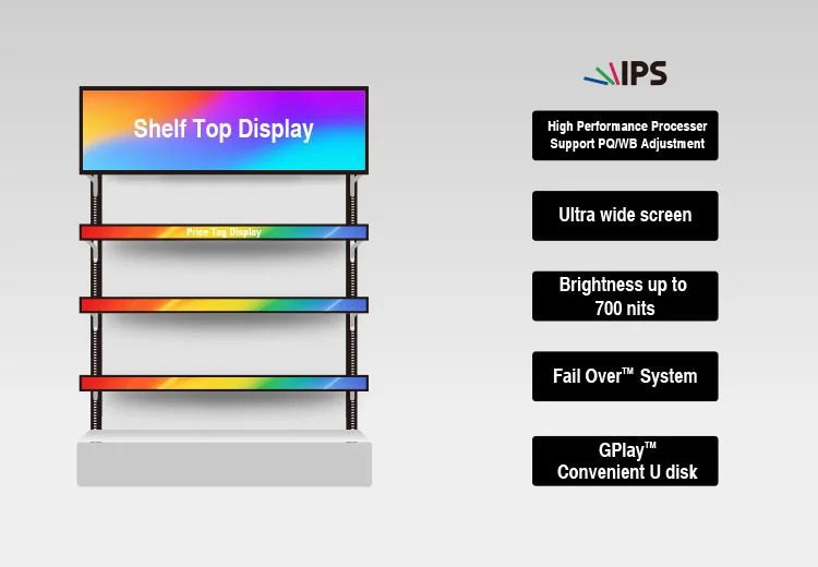 Las pantallas AVDVENDING Series son ideales para la exposición de productos al por menor. Con la función de empalme, es capaz de mostrar los productos de la forma que desee. Ampliamente utilizado en supermercados, tiendas, centros comerciales, bancos, transporte, metro, autobuses, hoteles, etc..