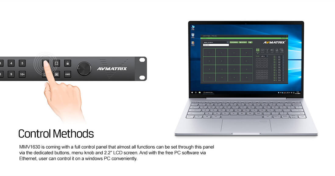 El MMV1630 es la solución perfecta para grandes proyectos de transmisión. Un solo dispositivo admite dos modos: multivisor SDI de 16 canales y matriz de conmutación SDI 16×16. La señal de entrada detecta automáticamente SD, HD y 3G-SDI. El formato de video de salida multivisor se puede seleccionar entre 9 formatos, desde 720p hasta 1080p. Además, este dispositivo cuenta con 20 diseños estándar con preajustes 16/12/11/10/9/8/6/4. Incluso puede configurar cualquier señal de entrada en pantalla completa mediante el atajo de teclado. El MMV16310 también admite UMD, medidor de audio, estado de señal y superposición de código de tiempo. Todas las funciones se controlan rápidamente mediante el software para PC o los botones y perillas del panel frontal.