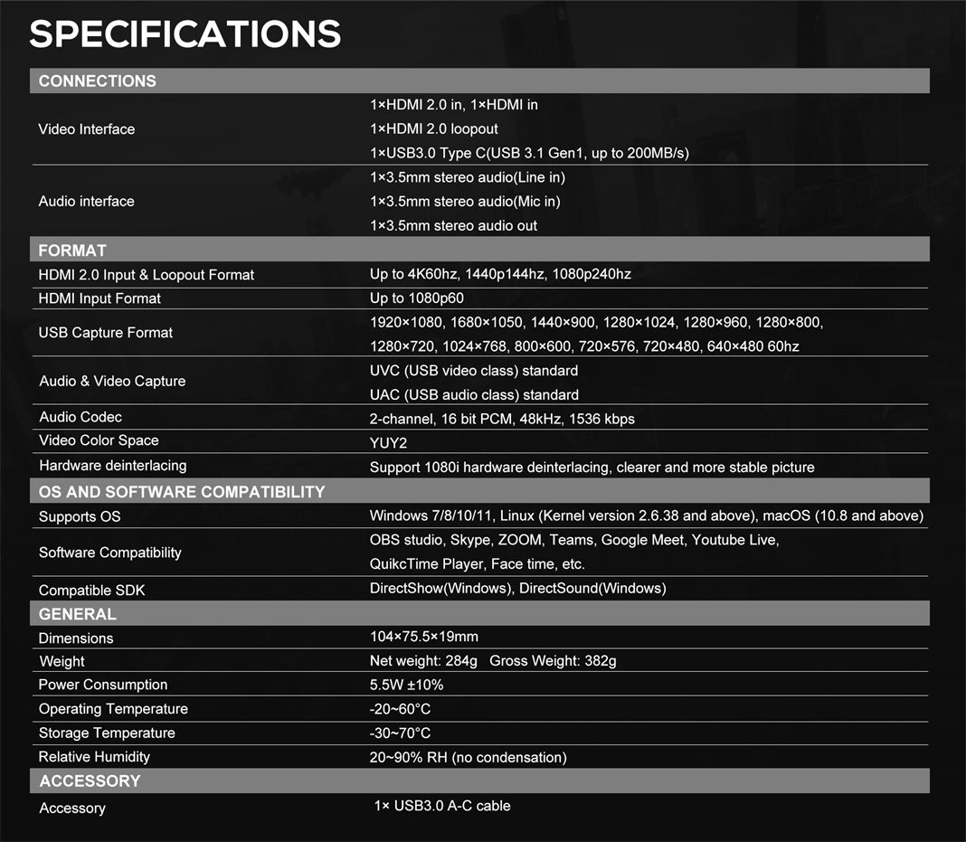 • Captura de video y audio sin comprimir, cumple con UVC y UAC