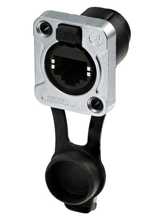 Receptáculo hembra RJ45 con brida de tamaño D de montaje frontal, contactos chapados en oro y clasificación IP65 para proteger de manera óptima su dispositivo o equipo contra la entrada de agua.
