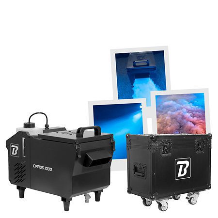 Diseñado para uso en interiores, este paquete incluye la máquina de humo de alta potencia Cirrus 1000 de BoomTone DJ y su estuche de transporte. Con un caudal de 3200 pies cúbicos/min, crea una densa capa de humo que realza los haces de luz en el escenario.